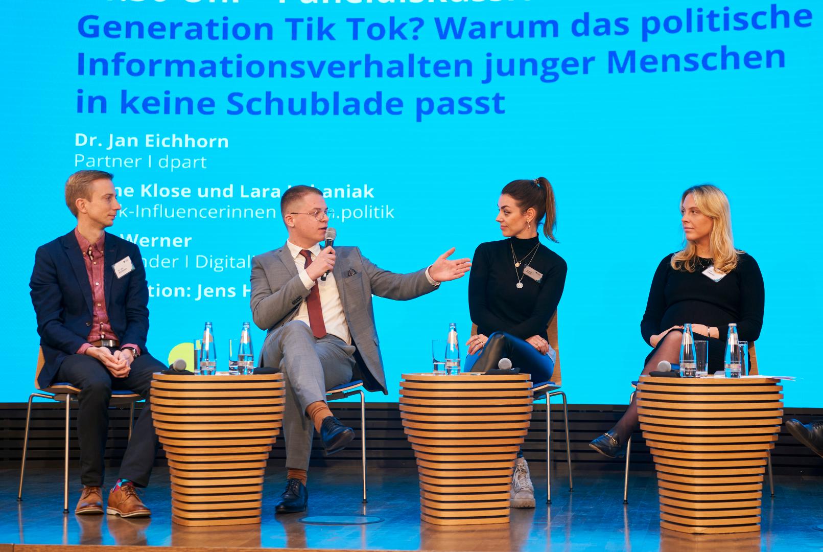 Für Politikerinnen und Politiker ist das natürlich kein leichtes Unterfangen. Janine Klose und Lara Urbaniak, Gründerinnen des Kanals „insta.politik“ wissen um die Schwierigkeit, politische Inhalte über Social Media zu vermitteln. Eine Herausforderung ist dabei die Trend-Plattform Tiktok, die besonders in der Generation Z eine wichtige Rolle einnimmt: „Die App polarisiert sehr stark und ist weniger ein Erklär-Kanal.“ Dennoch argumentiert Finn Werner, Co-Founder von Digitalien, sollte Tiktok nicht unterschätzt und in der Kommunikation stärker berücksichtigt werden. Die Plattform sei für viele junge Menschen ein Kanal, um sich niedrigschwellig zu informieren. Auch deshalb rät Lara Urbaniak, dass „Politiker sich trauen, dort aktiv zu sein, um junge Menschen abzuholen.“