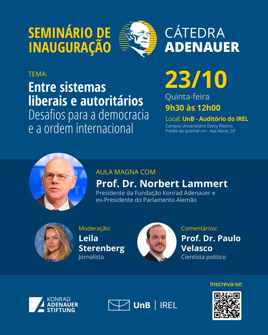 Para a inauguração da Cátedra, receberemos o Presidente Global da Fundação Konrad Adenauer e ex-presidente do Parlamento Alemão, Prof. Dr. Norbert Lammert, que ministrará a aula magna “Entre sistemas liberais e autoritários: desafios para a democracia e a ordem internacional”. O evento contará com moderação da jornalista Leila Sterenberg e comentários do Prof. Dr. Paulo Velasco, doutor em Ciência Política e comentarista de política internacional.
