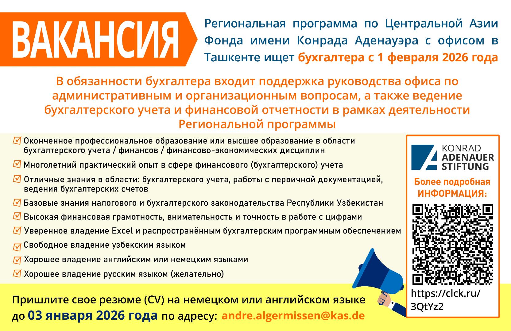 Фонд имени Конрада Аденауэра насчитывает более 1600 сотрудников по всему миру и занимается политическим образованием, консультированием, европейским и международным сотрудничеством, а также исследованиями и поддержкой одаренной молодёжи. Региональная программа по Центральной Азии Фонда имени Конрада Аденауэра, расположенная в Ташкенте, ищет бухгалтера с 1 февраля 2026 года.