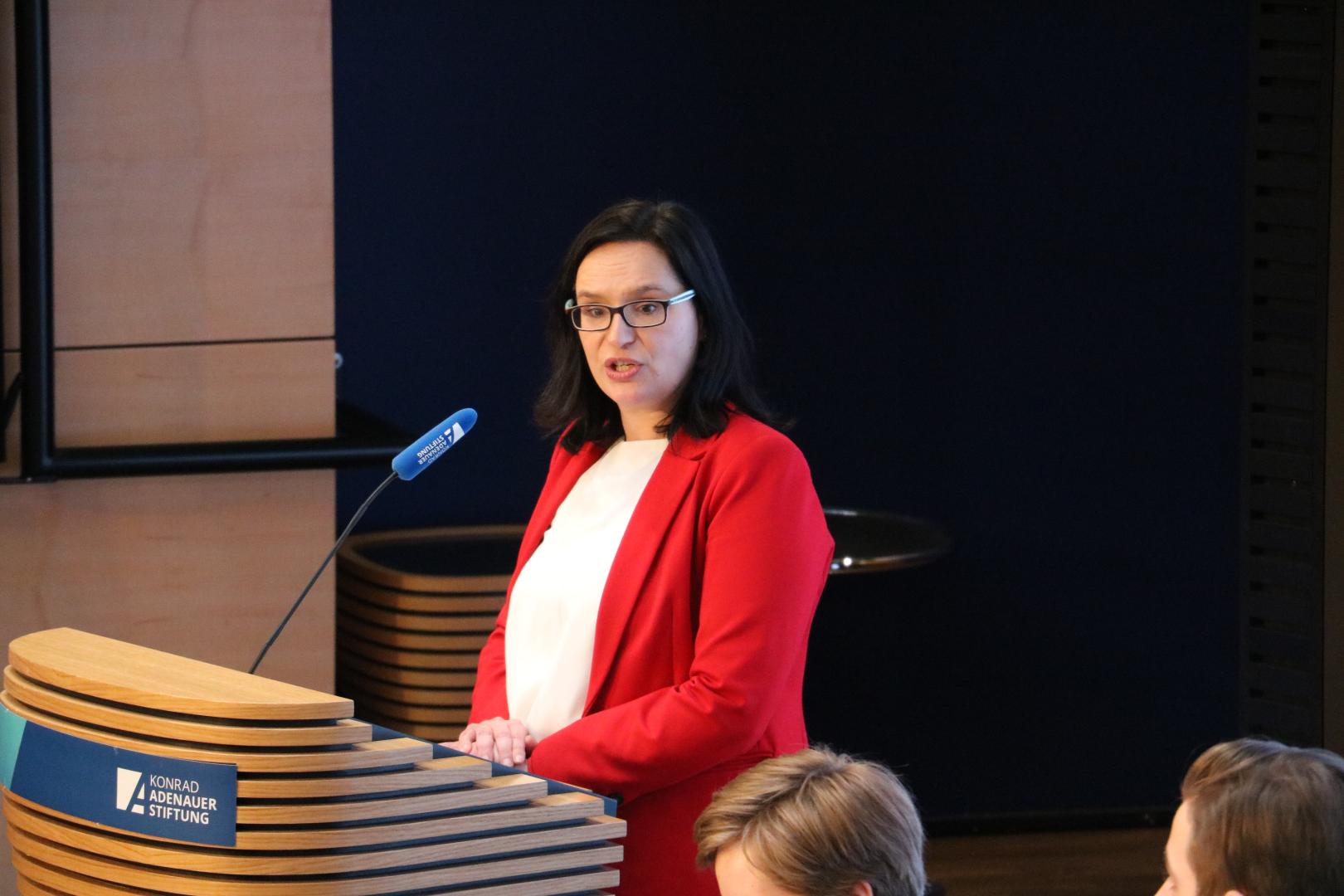 Mit Beginn der Zeremonie begrüßte Dr. Sandra Busch-Janser (Konrad-Adenauer-Stiftung) die Schülerinnen und Schüler und brachte ihre Freude zum Ausdruck, so viele politisch-interessierte junge Menschen in den Räumen der Konrad-Adenauer-Stiftung begrüßen zu können. In ihrer Rede hob sie die zentrale Bedeutung des Themenschwerpunktes Nachhaltigkeit hervor. Das beeindruckende Engagement der Schülergruppen stellte sie mit dem Leitbild der Konrad-Adenauer-Stiftung „Gemeinsam.Demokratie.Gestalten.“ in Verbindung.