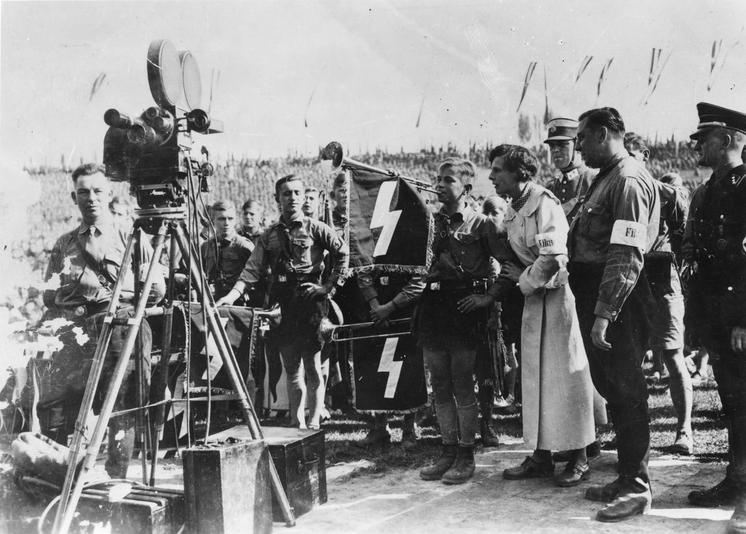 Propagandafoto von Leni Riefenstahl bei Aufnahmen zum Propagandafilm „Triumph des Willens“ über den NSDAP-Parteitag in Nürnberg 1934. Bundesarchiv / Bild 183-R80430 / Fotograf: ohne Angabe