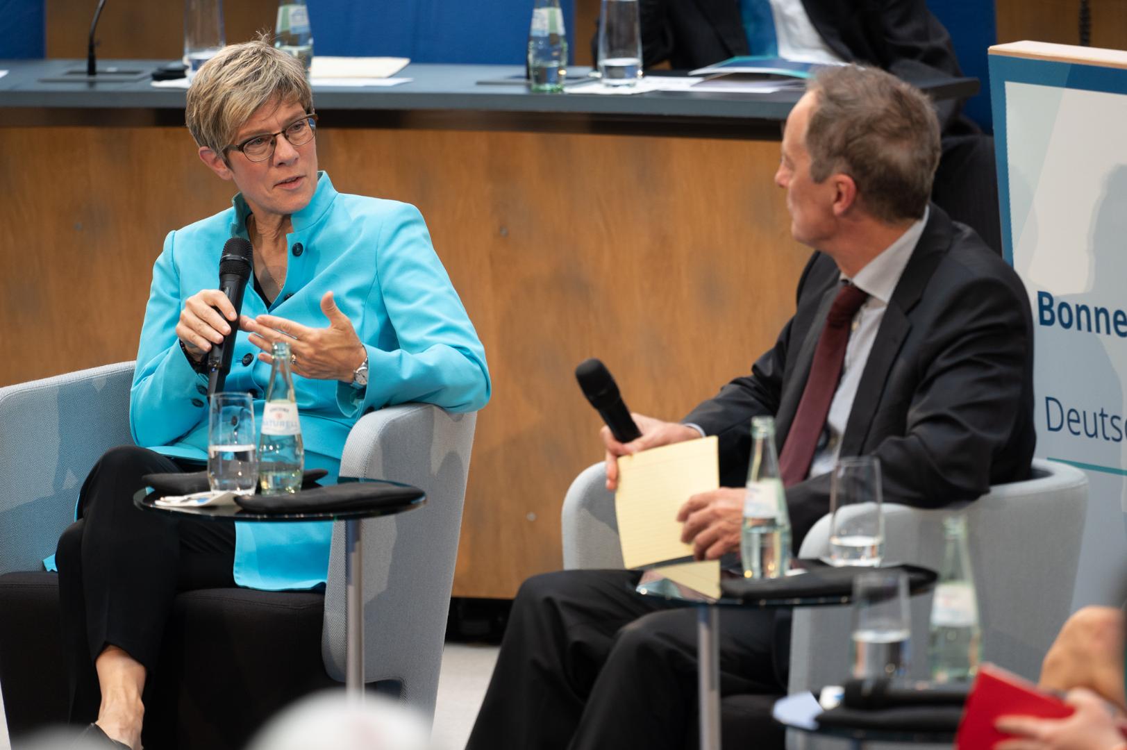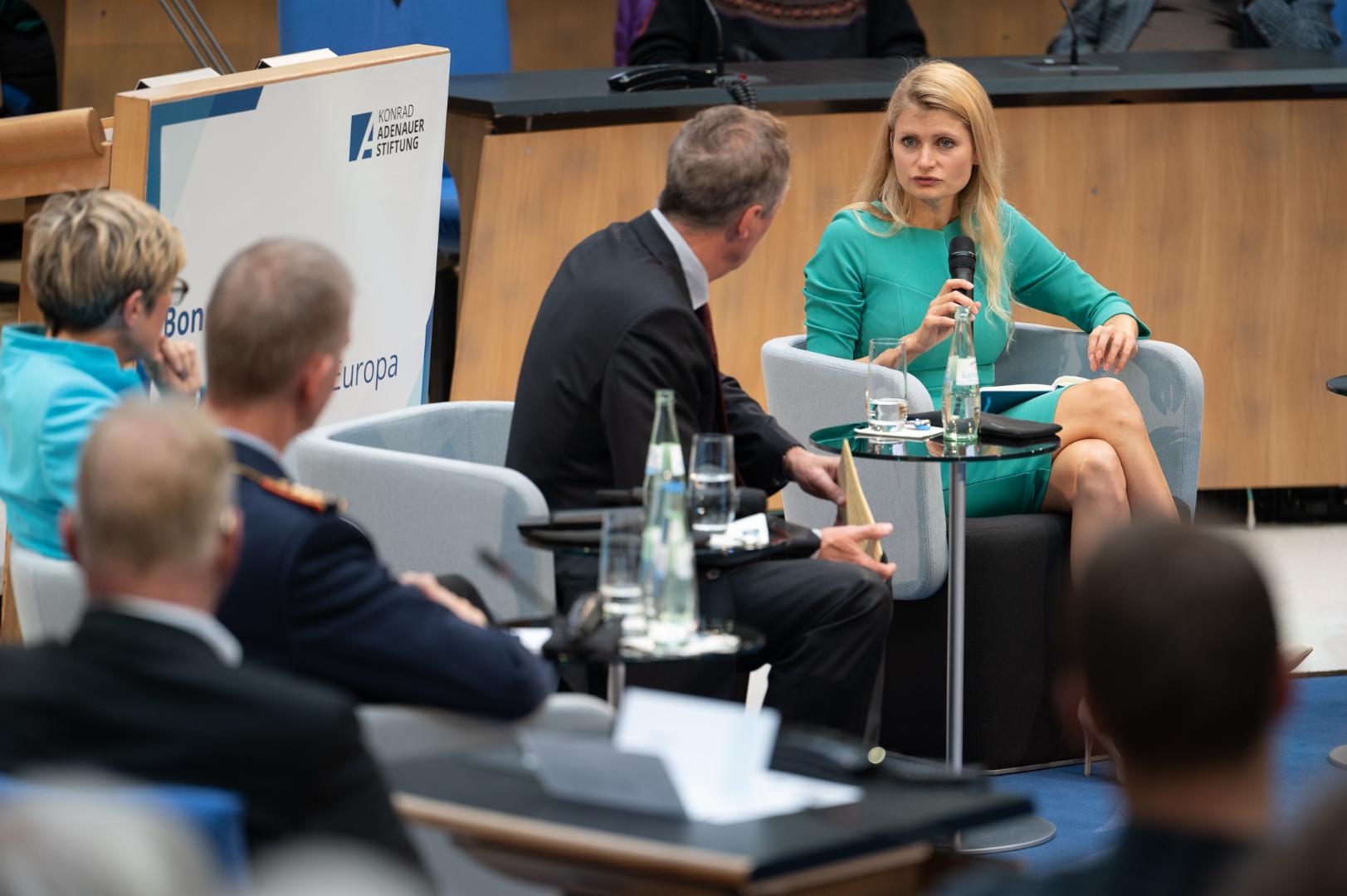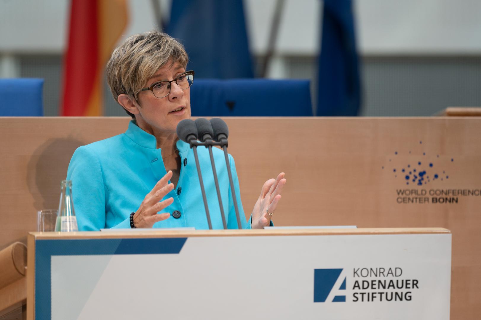 Auch Annegret Kramp-Karrenbauer sprach davon, dass der „Schleier entfernt“ wurde, hinter dem das zunehmend totalitäre und aggressive Russland pastellener erschien, als es brutale Wirklichkeit war. Und sie verband das mit dem stillen, aber nachhaltigen Satz, dass „wir nicht einfach zur Vergangenheit zurückkehren können“. Die Welt habe „sich unwiderruflich verändert“ und „wir müssen das auch tun“. Was heißt das? Im Folgenden zeigte sie ein changierendes Bild: Zwar seien die westlichen Bündnisse NATO und EU prima facie erstarkt, geeint, doch zeigen sich auch sehr unterschiedliche Ansätze eines gemeinsamen entschlossenen Vorgehens. Es gebe ein Momentum, aber es müsse auch genutzt werden, z.B. durch eine höhere Eigenleistung der EU in Verteidigungsfragen, z.B. durch mehr deutsche Verantwortung in der Welt. Oft gefordert, zögert die deutsche Gesellschaft davor. Zu stark ist noch die Sorge, dass größere Verantwortung Militarismus bedeute. Aber Kramp-Karrenbauer plädiert dafür, sich mehr für Freiheit, Menschenrechte und Frieden einzusetzen, „mit Respekt und Achtung“, um „endlich der Welt zurückzugeben, was wir erhalten haben“. Sie endete optimistisch, weil auch die deutsche Gesellschaft mehrheitlich eine freie Welt wolle.