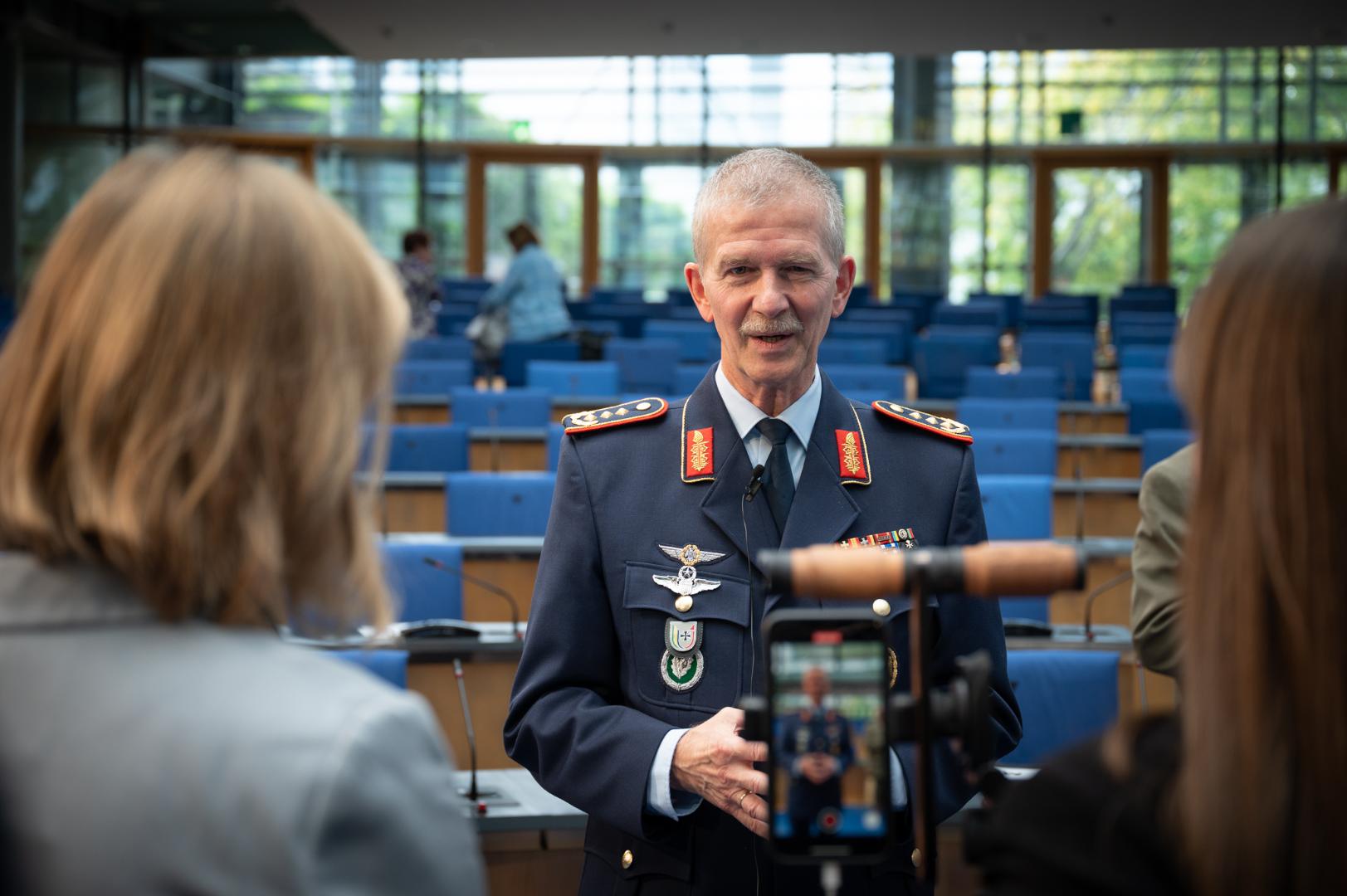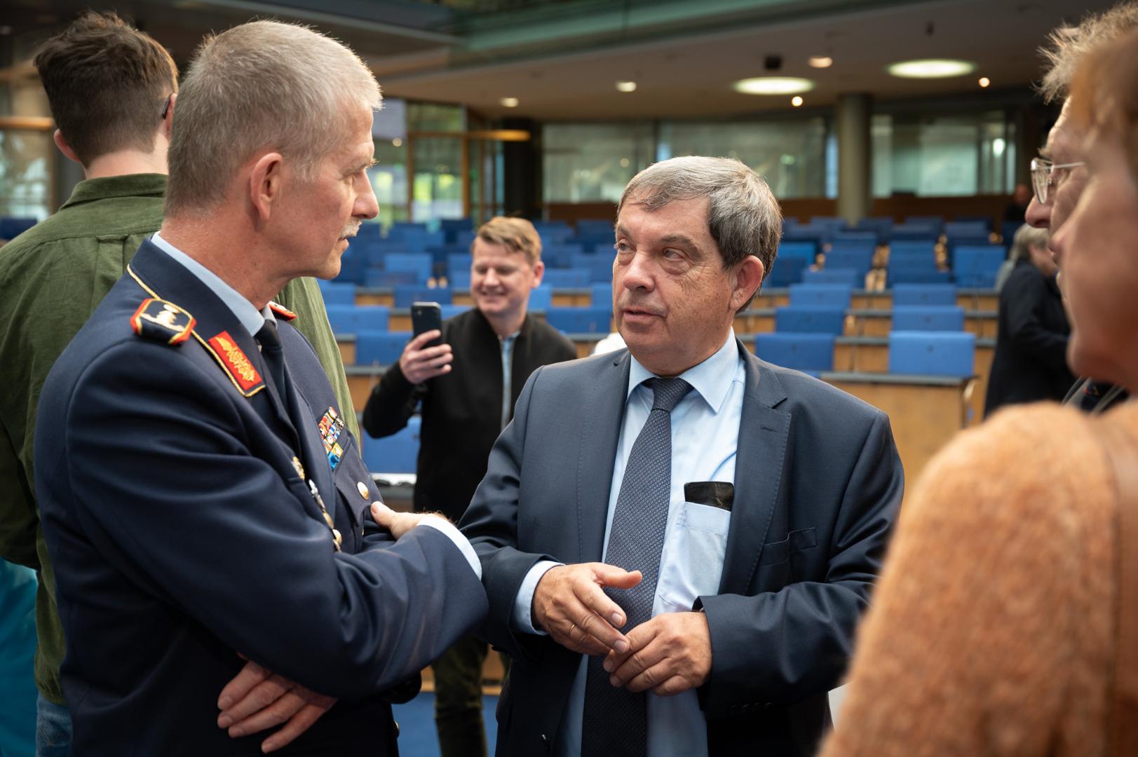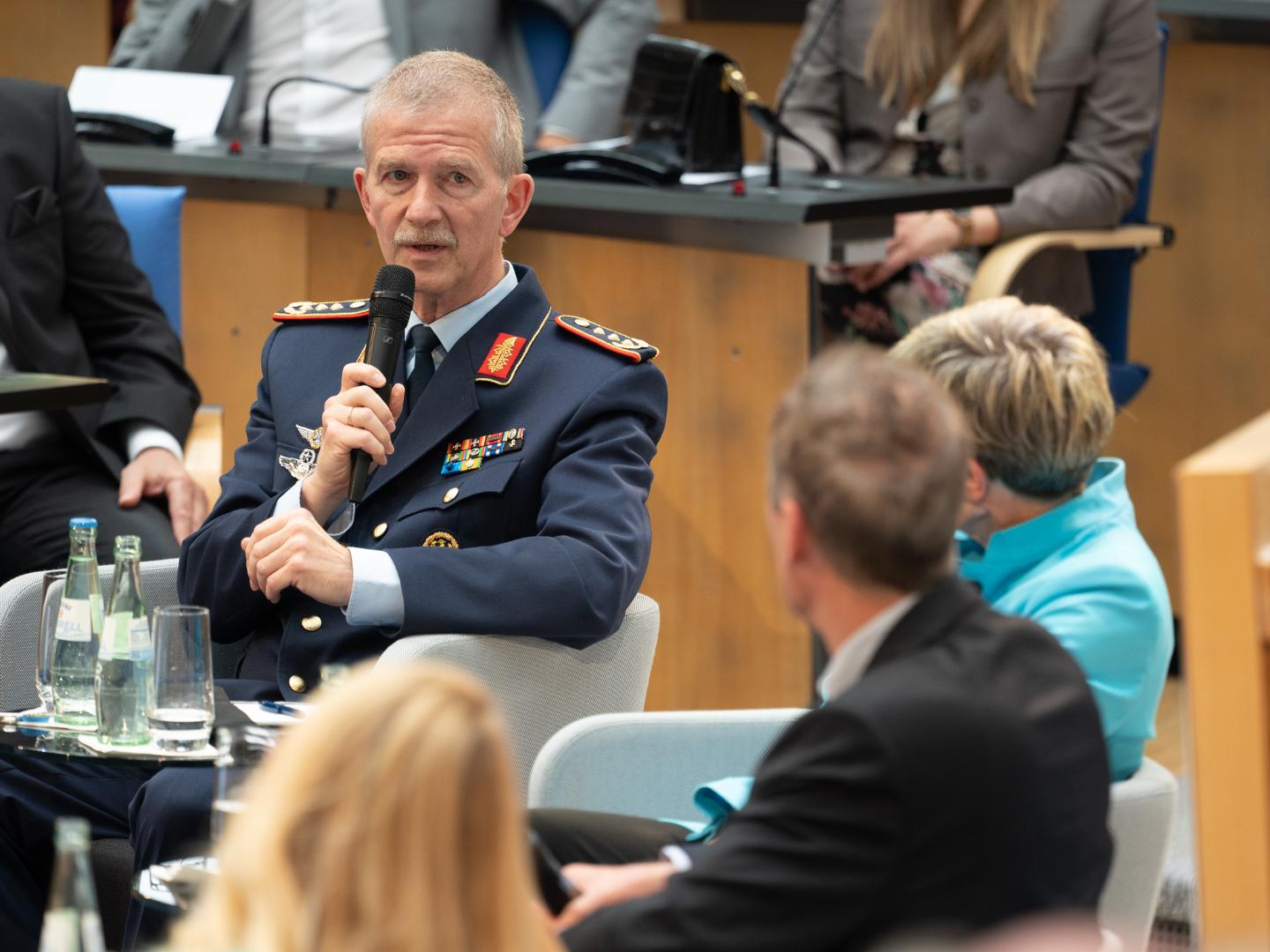 In der anschließenden, von Michael Krons moderierten Diskussion kamen Sicherheitsexpertinnen und ein ranghoher Bundeswehrgeneral dazu. Dr. Ulrike Franke vom European Council on Foreign Relations, Vanessa Vohs von der Universität der Bundeswehr und Generalleutnant Martin Schelleis, Inspekteur der Streitkräftebasis, konnten den allgemeinen Ausführungen konkrete Argumente an die Hand geben. Sie breiteten im Saal den Realismus aus, der vor der „Zeitenwende“ zu wenig erhört wurde: dass die Bundeswehr auch noch nach dem 100 Milliarden Programm einen stetigen Aufwuchs brauche (Schelleis), dass die deutsche Befindlichkeit und Zögerlichkeit in den USA und den mittelosteuropäischen Staaten zunehmend weniger verstanden werde (unisono alle), dass die EU in Verteidigungsfragen viel wolle, aber wenig vermöge (Franke), dass sogar Frankreich dem deutschen Nachbarn aufgrund seines Status als Parlamentsarmee kein entschlossenes Handeln zutraue (Schelleis). Es sei eine ganze Welt des politischen Denkens an ihr Ende gekommen, der Glaube an die Kraft internationalen Rechts und an Verträge, also der Glaube, der in Deutschland die frömmsten Anhänger hat. Vanessa Vohs hält dies für eine „naive Vorstellung“. Und im Hintergrund droht die neue Herausforderung China, das genauso rosarot betrachtet worden ist. Die Expertinnen und Schelleis empfinden diese Zeit als Zeit der Prüfung, in der sich entscheide, wie resilient und verteidigungsfähig der Westen sei.