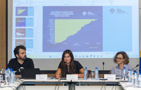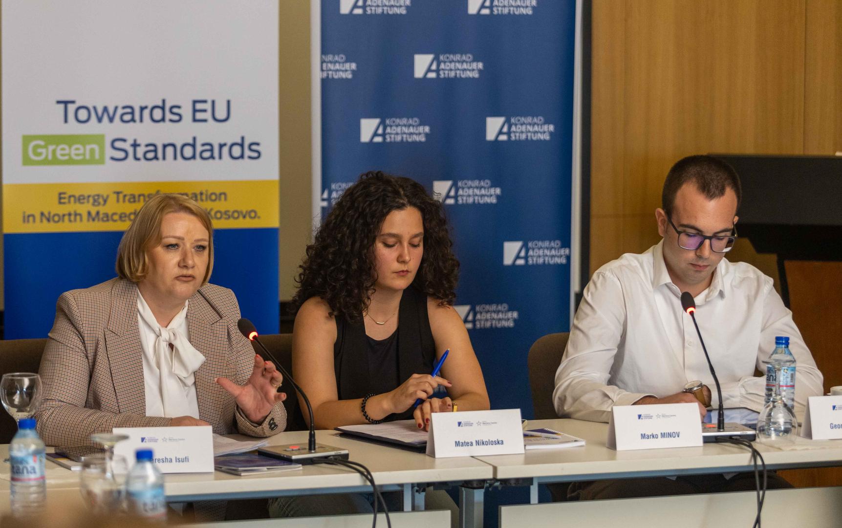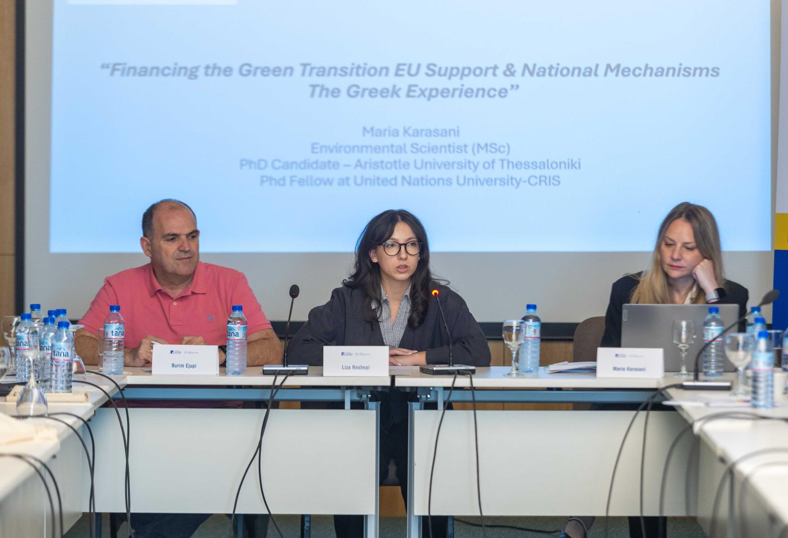 Pas pushimit të kafesë, paneli i fundit i ditës u përqendrua te Financimi i Tranzicionit të Gjelbër – Mbështetja e BE-së dhe Mekanizmat Kombëtarë të Financimit. Burim Ejupi, drejtor ekzekutiv i INDEP, dhe Maria Karasani, M.S., prezantuan instrumentet e BE-së, fondet kombëtare dhe mundësitë e investimit në transformimin e gjelbër. Diskutimi u moderua nga Liza Rexhepi, bursiste e KAS.
