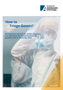 Unter Triage ist die Auswahlentscheidung zu verstehen, die von ärztlicher Seite getroffen werden muss, wenn im Falle erschöpfter Intensivkapazitäten nicht mehr alle Patientinnen und Patienten ausreichend versorgt werden können. Nach den beiden Entscheidungen zur Bundesnotbremse vom November 2021 erschien damit der dritte Beschluss, in dem sich das höchste deutsche Gericht zu Fragestellungen rund um die Corona-Thematik äußerte.