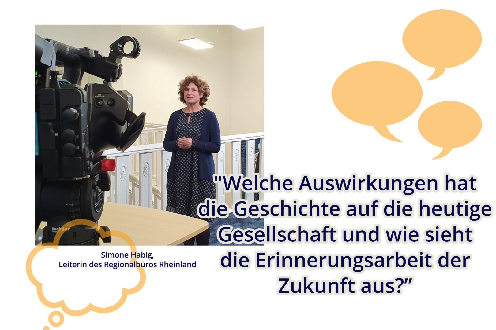 Zunächst begrüßt die Leiterin des Regionalbüros Rheinland, Simone Habig, die Gäste im Livestream: „Welche Auswirkungen hat die Geschichte auf die heutige Gesellschaft und wie sieht die Erinnerungsarbeit der Zukunft aus?“ Danach stiegen die Podiumsgäste in die Diskussion ein – mit einem Thema, das alle derzeit in ihrer Arbeit bewegt: Die Covid-19 Pandemie. Die Verlegung der Stolpersteine habe sich verändert, sagt Katja Demnig, die als pädagogische Mitarbeiterin in dem Projekt mitwirkt: „Viel, was vorher auf der Straße passierte, geht jetzt digital – Verlegungen werden jetzt zum Beispiel per Video übertragen.“ Es sei wichtig zu wissen für die Angehörigen, die jetzt nicht aus anderen Ländern zu den Verlegungen anreisen können, dass de Verlegungen weitergehen, ergänzt Künstler Gunter Demnig: „Wir machen weiter!“