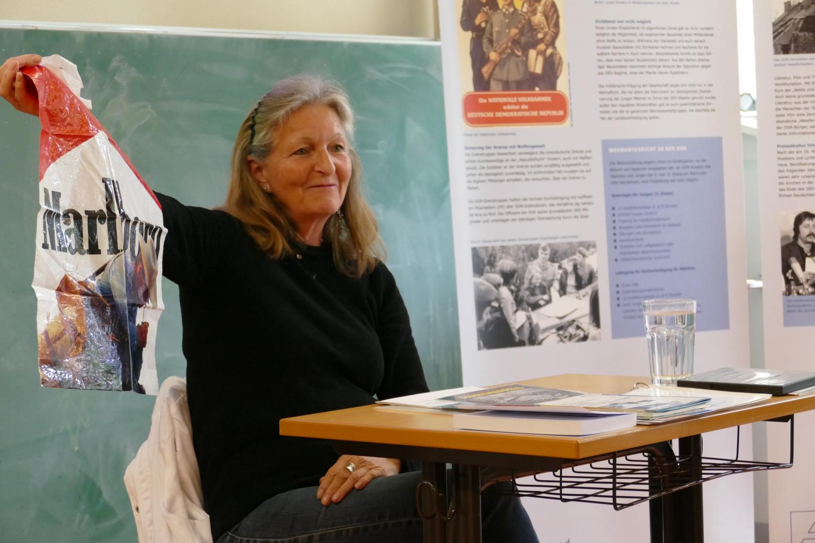Die Veranstaltungen klangen jeweils mit einem Kurzfilm aus, in dem zwei weitere Frauen ihre persönlichen Erlebnisse in Hoheneck schilderten. Zum Ende konnten die Schülerinnen und Schüler noch Fragen stellen. Diese Möglichkeit wurde genutzt, um mehr über die familiären Verhältnisse von Elke Schlegel während ihrer Zeit in der DDR, aber besonders danach zu erfahren. Die Haft hätte Elke Schlegel nur durchstehen können, weil sie ihr Kind wiedersehen wollte. Zum Bruder hat sie heute keinen Kontakt mehr. Sie betonte wie systematisch Familien in der DDR gesprengt wurden. Auch über ihre Stasiakte berichtete Schlegel, 1200 Seiten kamen in nur vier Jahren zusammen. Die Frage, die sich Schlegel bis heute nicht erklären kann, ist, wie in so wenig Zeit so viel Inhalt zusammengetragen werden konnte und von welchen Personen diese Informationen geteilt wurden. Zurück bleiben bewegende und eindringliche Bilder.