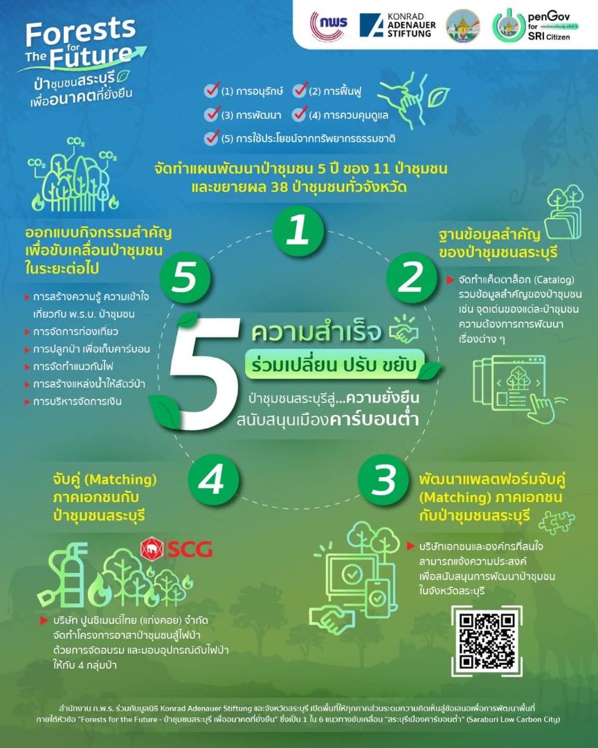 - แผนพัฒนา 5 ปี ส่งเสริมการดำเนินการในประเด็นการอนุรักษ์ การฟื้นฟูสภาพ การพัฒนา การควบคุมดูแล และการใช้ประโยชน์จากทรัพยากรในป่าชุมชนอย่างยั่งยืนและเป็นมิตรกับสิ่งแวดล้อม โดยแผนนี้เบื้องต้นจะมุ่งครอบคลุมพื้นที่ป่าชุมชน 11 แห่งที่เข้าร่วมกิจกรรม และจะขยายผลต่อไปยังป่าชุมชนอีก 38 แห่งทั่วจังหวัดสระบุรี