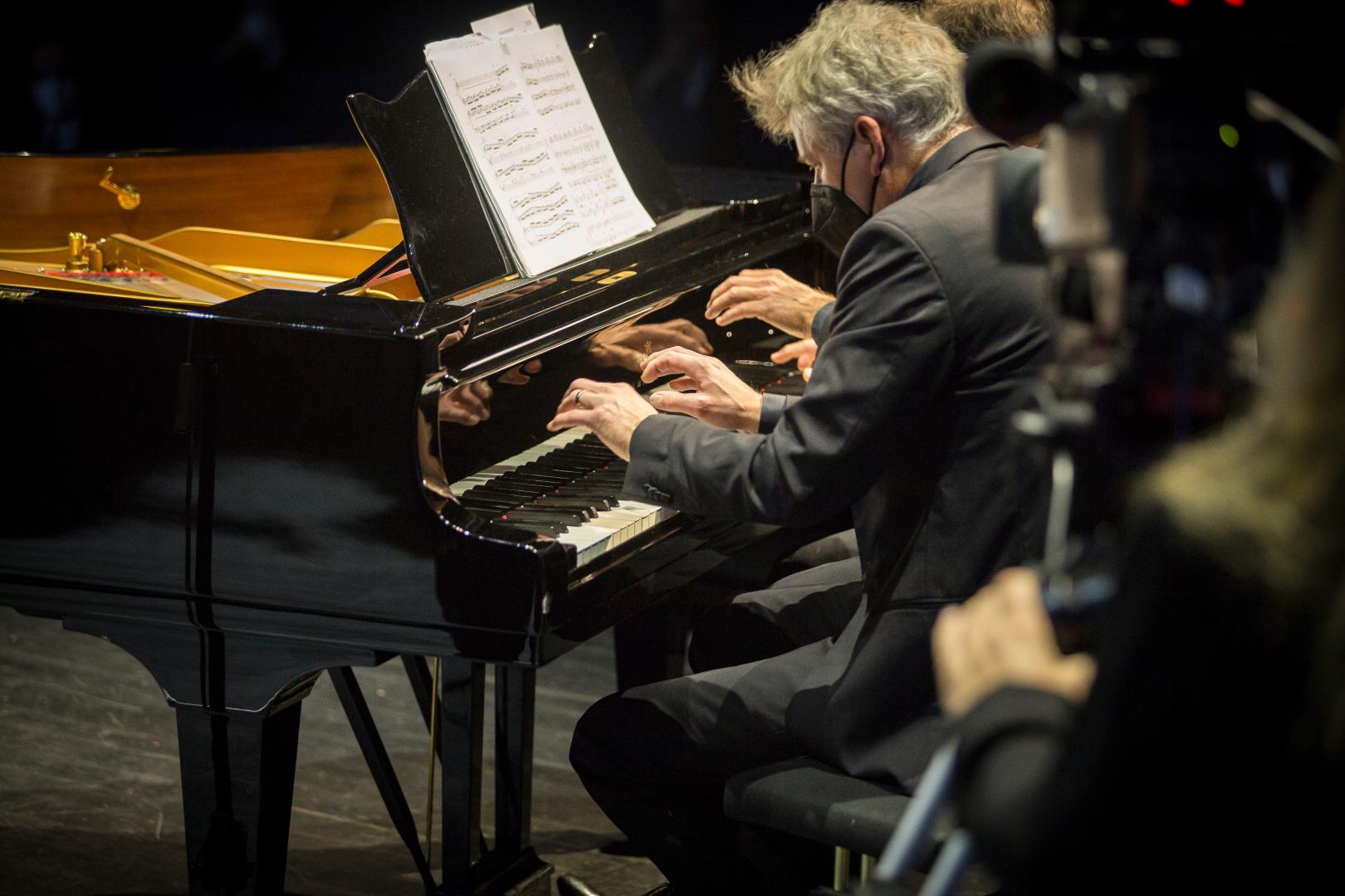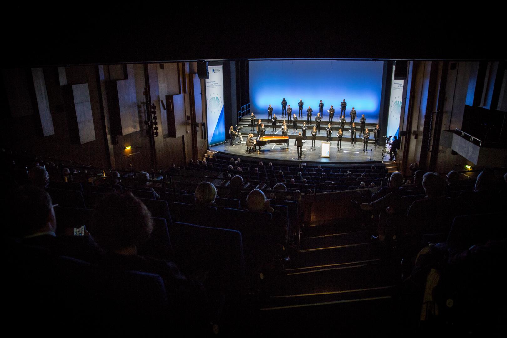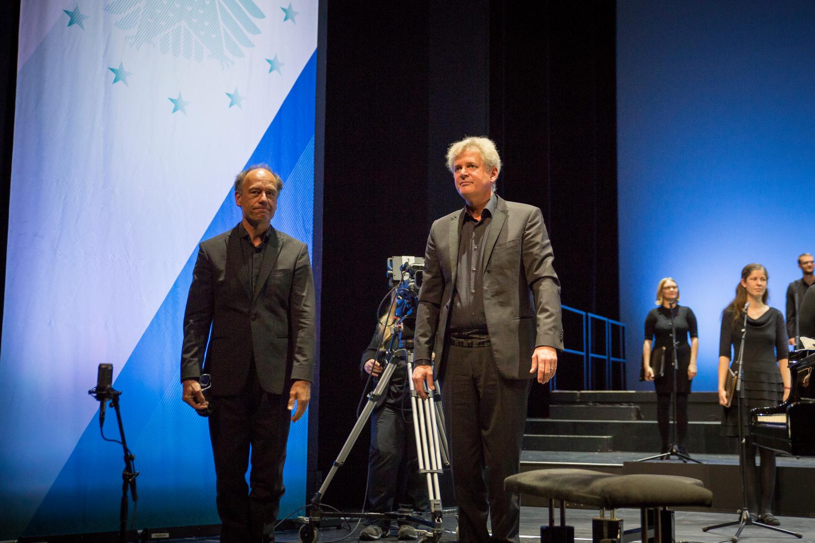 Und dann verstummten die Worte; die Pianisten und der Junge Kammerchor Köln traten auf die Bühne, Musik und gedichteter Text übernahm die Regie, streute Andeutungen von dem, was sein könnte, aus. „Für Europa lasst uns streiten…, um den Fortschritt zu begleiten, der noch nicht begriffen hat, was wir können, was wir wollen.“ Europa ist da, aber es ist noch nicht selbst-bewusst genug, „denn es gibt noch die Dämonen, die in manchen Köpfen sind“. Das ganze hatte etwas Weihevolles, das einen größeren Zusammenhang erahnen ließ. Die Oper bot den feierlichen Rahmen dazu, zu viel Licht hätte der Erkenntnis geschadet. Die Bonnerinnen und Bonner können sagen, sie seien dabei gewesen. Ihr Applaus verriet, dass ihnen das sofort bewusst war.