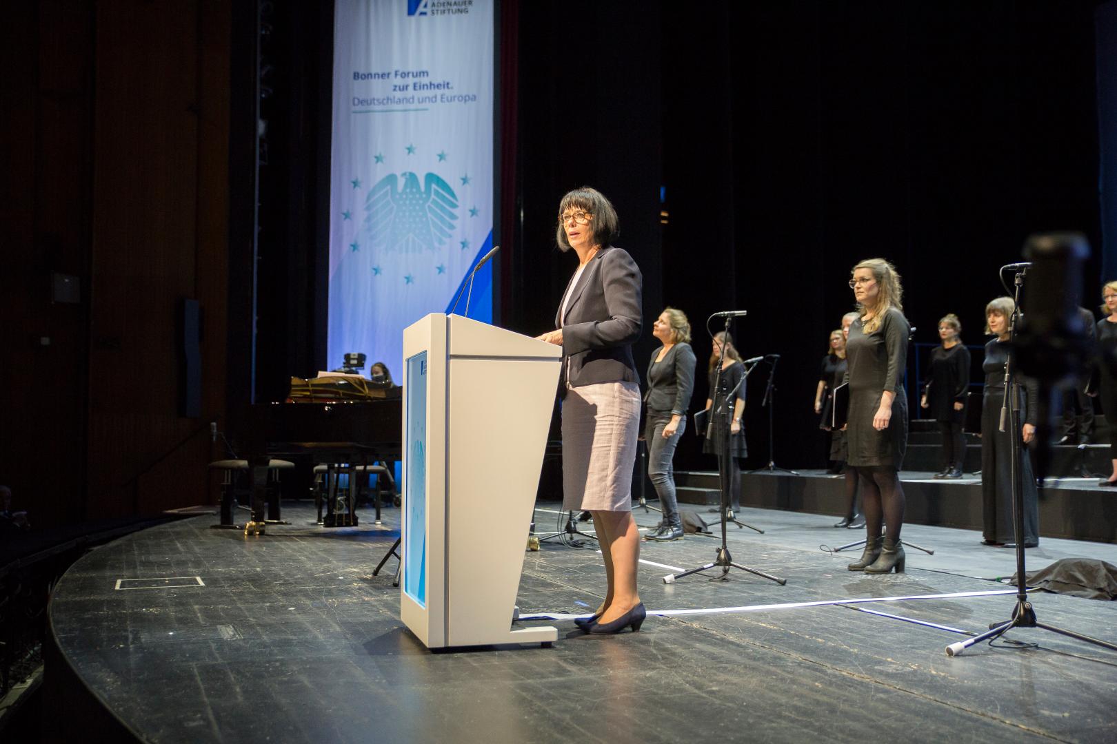 Covid-19 bringt alles durcheinander, auf tragische und auf erträgliche Weise. Dass das Bonner Forum zur Einheit, die herausragende Veranstaltung der Konrad-Adenauer-Stiftung in Bonn, dabei nicht ungeschoren davon kommen würde, war zu erwarten. Es war ein Erfolg und Ergebnis großer Anstrengungen, dass es vor Ort nur Verschmerzbares war, was diesmal fehlte: Der Smalltalk war hinter Masken versteckt, keine Getränke zur geistigen Erbauung, keine Blumensträuße für den Chor. Da war es schon viel bedauerlicher, dass zwei Drittel der interessierten Bonner Bürgerinnen und Bürger zu der Feierstunde nicht zugelassen werden konnte und sich mit dem Livestream zufrieden geben musste. Die erlaubten 300 Teilnehmerinnen und Teilnehmer verteilten sich im Parkett und auf den Rängen der Bonner Oper, die ein inspirierender Ort für das war, was dann kam.