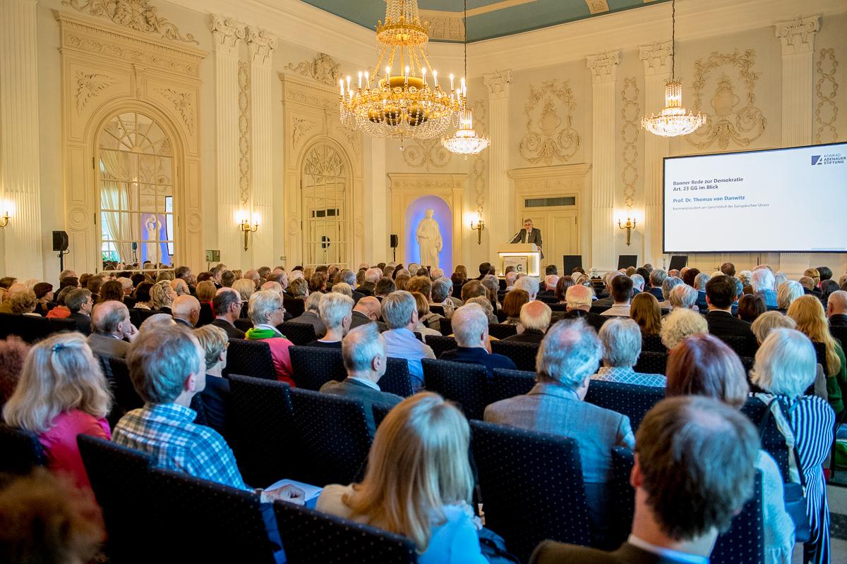 Anlässlich von „70 Jahre Grundgesetz“ war das Thema naheliegend. Und da das deutsche Grundgesetz nicht mehr ohne die Verfasstheit der Europäischen Union zu denken ist, stand der Europa-Artikel 23 im Mittelpunkt des Abends. Danwitz, Kammerpräsident am Gerichtshof der Europäischen Union und ausgewiesener Experte für Europarecht, öffnete eine weite historische Perspektive von Jubiläen: 1919 (Weimarer Reichsverfassung), 1949 (Grundgesetz), 1979 (erste Direktwahl des Europäischen Parlaments), 1989 (Fall der Mauer) stehen in einem inneren Zusammenhang. Ganz im Sinne des Jubiläums hielt er eine kluge Eloge auf die deutsche Verfassung, die als Grundgesetz zunächst als Provisorium gedacht, sich als stabil und wetterfest erwiesen hat.