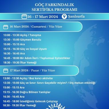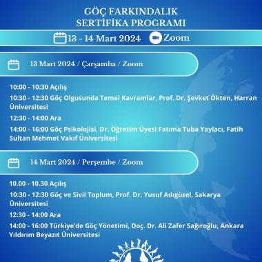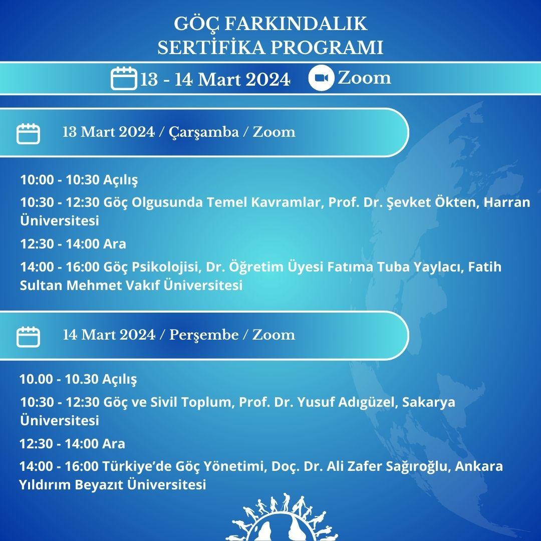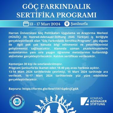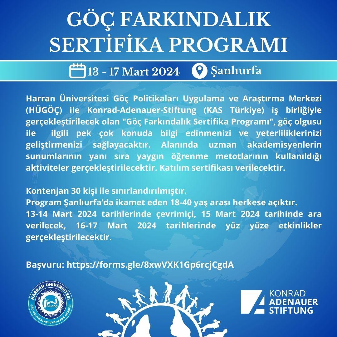 Harran Üniversitesi Göç Politikaları Uygulama ve Araştırma Merkezi (HÜGÖÇ) ile Konrad-Adenauer-Stiftung (KAS) Türkiye iş birliğiyle gerçekleştirilecek olan "Göç Farkındalık Sertifika Programı", göç olgusu ile ilgili pek çok konuda bilgi edinmenizi ve yeterliliklerinizi geliştirmenizi sağlayacaktır. Alanında uzman akademisyenlerin sunumlarının yanı sıra yaygın öğrenme metotlarının kullanıldığı aktiviteler gerçekleştirilecektir. Katılım sertifikası verilecektir.