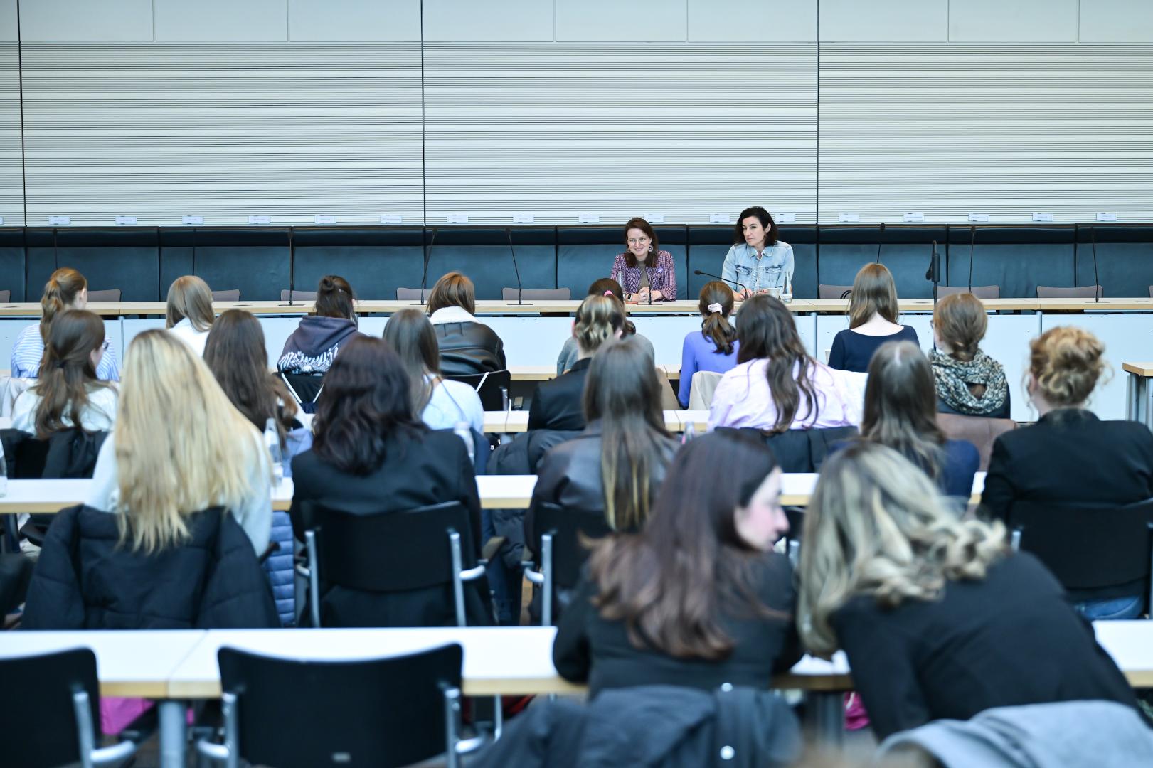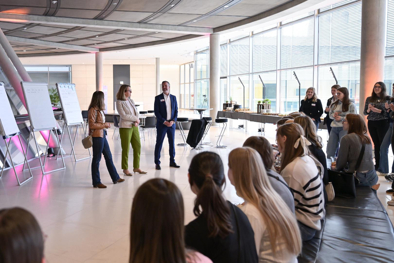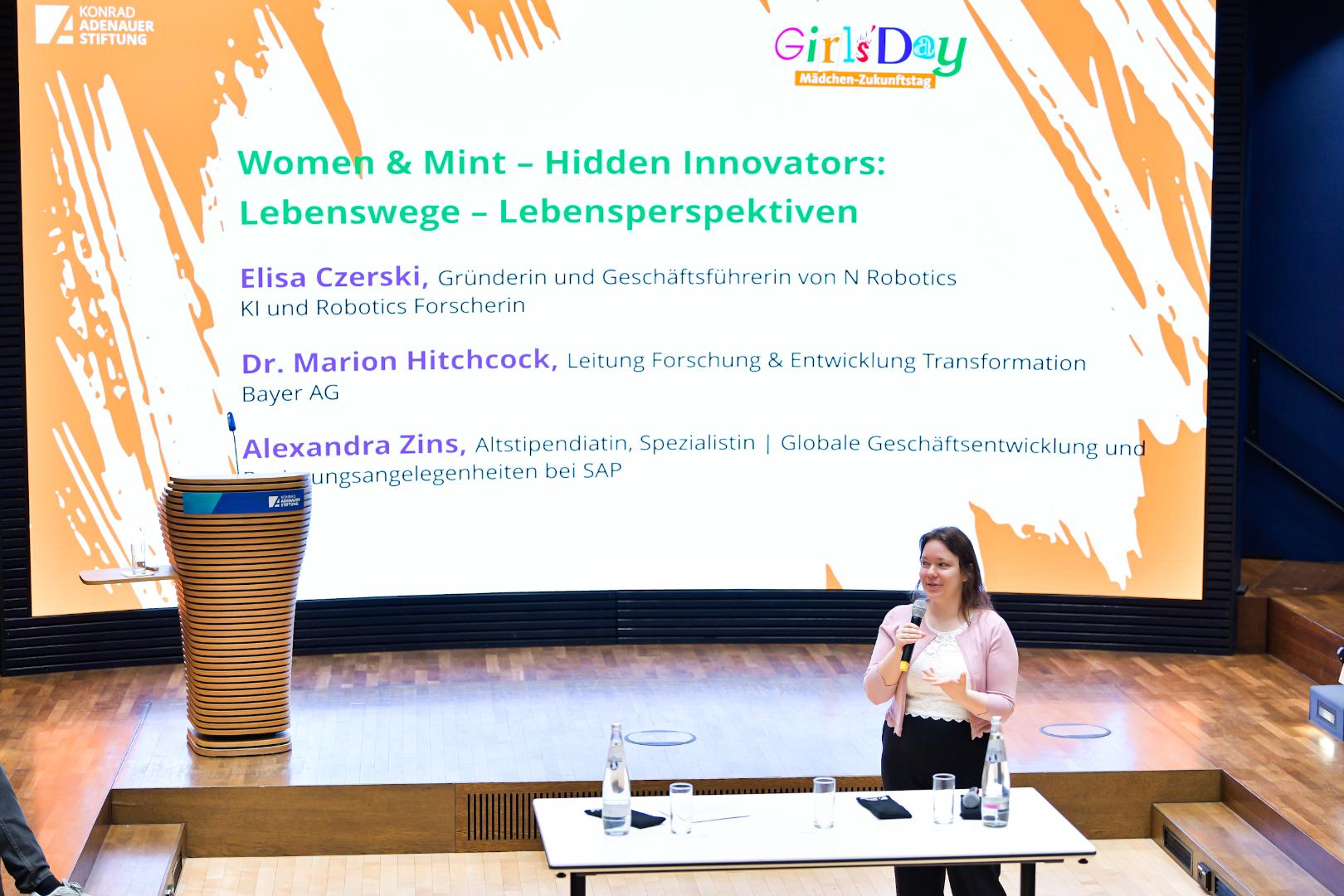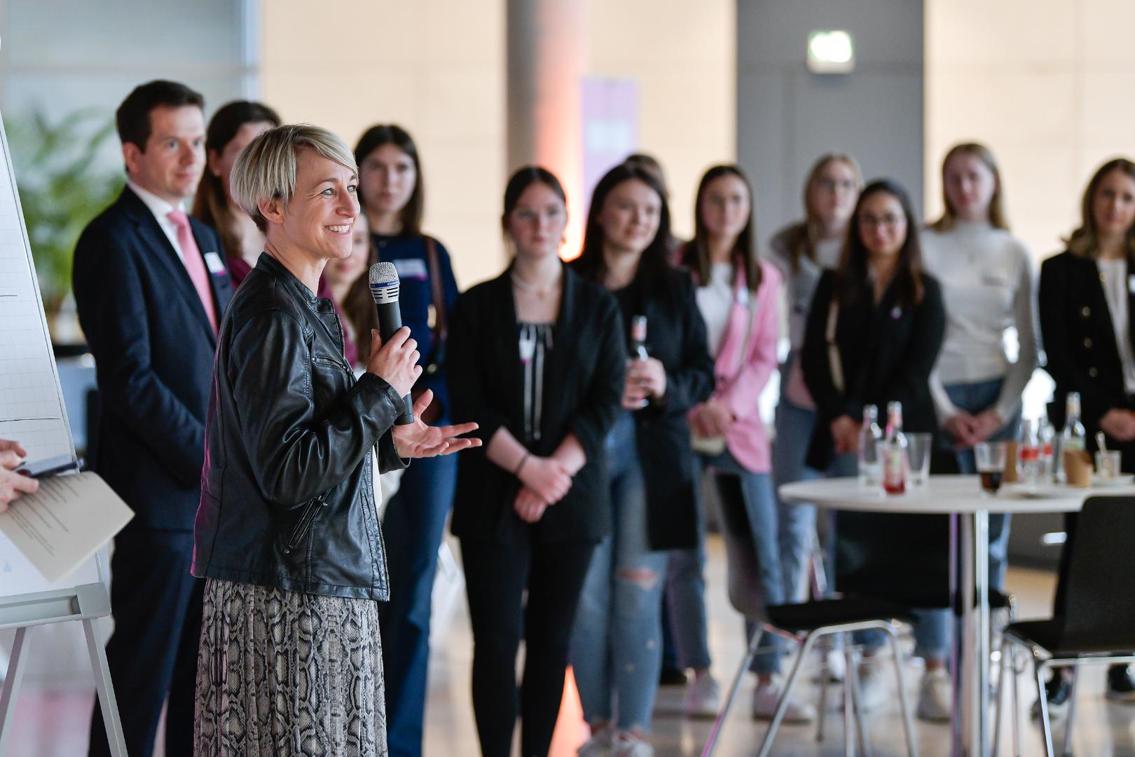 Das es auch anders geht, bewiesen im Anschluss Chemikerin Dr. Marion Hitchcock (Leiterin Forschung & Entwicklung Transformation bei der Bayer AG), KI und Robotics Forscherin Elisa Czerski (Gründerin und Geschäftsführerin von N Robotics) und Wirtschaftsinformatikerin Alexandra Zins (Direktorin Globale Geschäftsentwicklung und Regierungsangelegenheiten bei SAP), die persönliche Einblicke in ihre beruflichen Tätigkeiten und Lebenswege sowie ihre Erfolge aber auch die Herausforderungen, auf die man als Frau in von Männern dominierten Berufsfeldern trifft, im gemeinsamen Gespräch mit den Teilnehmerinnen teilten.