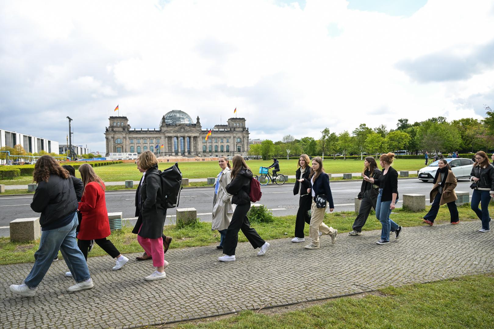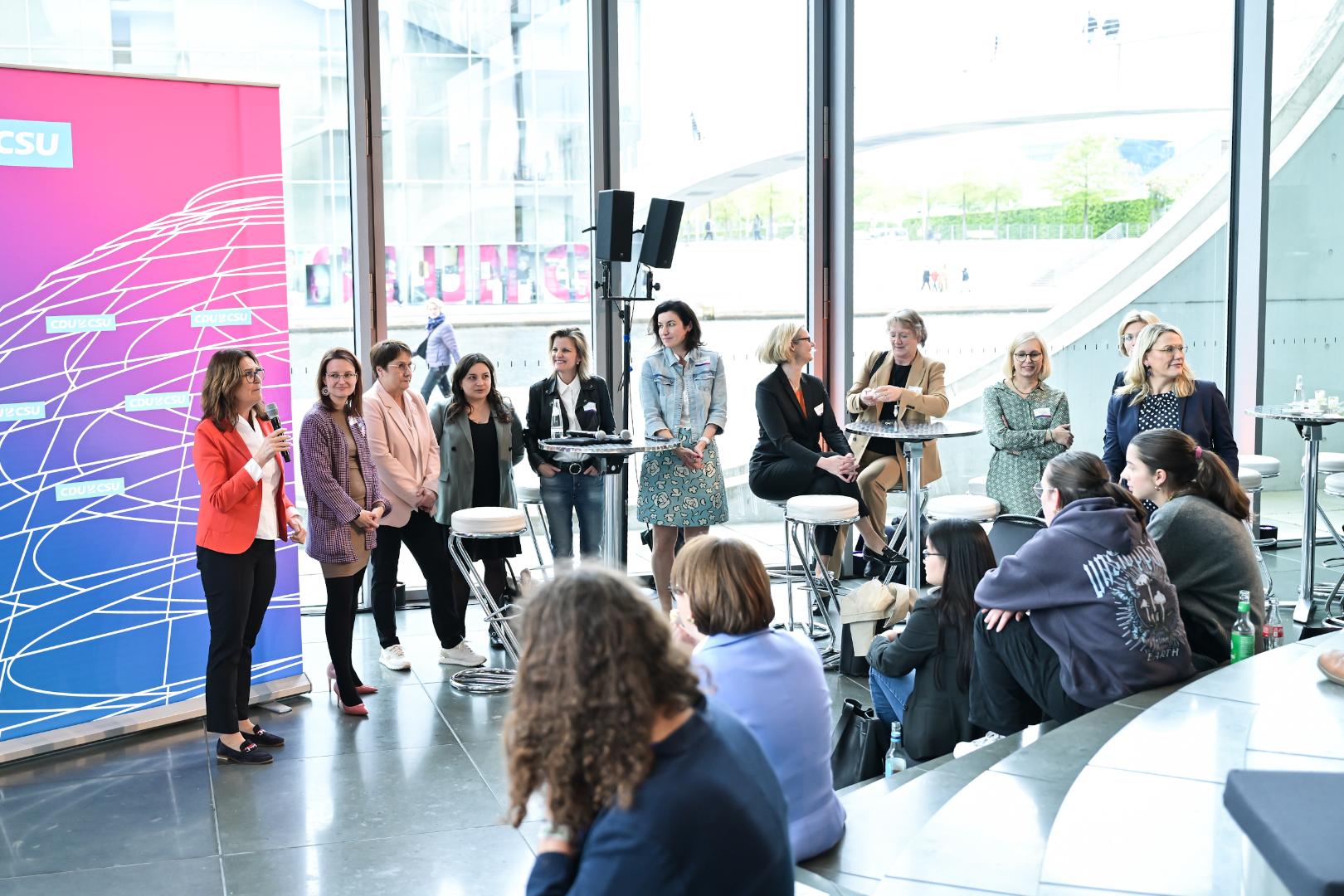 Nach einem Spaziergang durch den Berliner Tiergarten trafen die Teilnehmerinnen im Deutschen Bundestag auf Abgeodnete aus der Gruppe der Frauen der CDU/CSU-Bundestagsfraktion. Auch in der Politik seien Frauen noch immer unterrepräsentiert. So würde der Anteil der weiblichen Abgeordneten in der Fraktion gerade einmal ein Viertel ausmachen, erläuterte Mechthild Heil MdB, die Vorsitzende der Gruppe der Frauen. Beim gemeinsamen Mittagessen bot sich Raum für viele Gespräche zwischen den Teilnehmerinnen und den Abgeordneten, u.a. mit Christina Stumpp MdB (stellv. Generalsekretärin der CDU Deutschlands), Nadine Schön MdB und Dorothee Bär MdB (beide stellv. Fraktionsvorsitzende), Bundestagsvizepräsidentin Yvonne Magwas MdB, Anja Karliczek (Bundesministerin für Bildung und Forschung a.D.), Christiane Schenderlein MdB und Kerstin Radomski MdB. Vor der Verabschiedung im Fraktionsitzungssaal erhielten die Teilnehmerinnen während einer Fürhrung durch den Bundestag ausgiebige Einblicke in den parlamentarischen Arbeitsalltag.