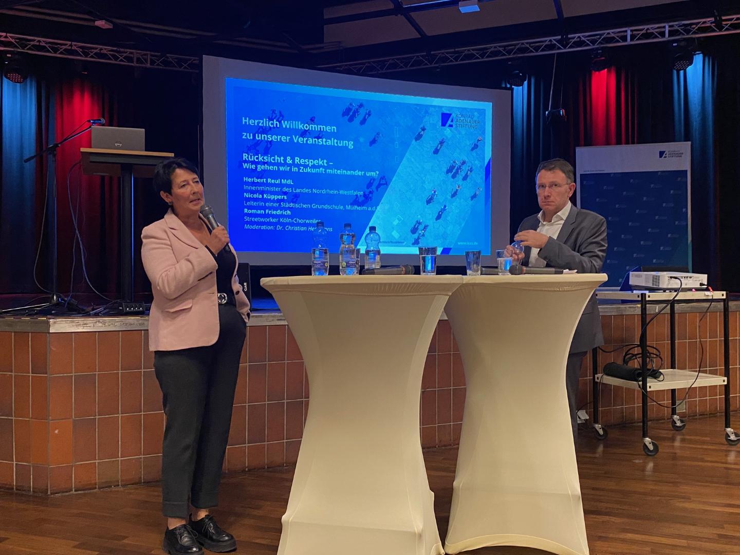 Ein Gesicht dieser vielen Initiativen ist der russlanddeutsche Streetworker Roman Friedrich, der auf dem Podium mit Herbert Reul diskutierte und immer wieder Beispiele aus seinem Alltag anführte. Mit dabei auch die Pädagogin Nicola Küppers, Leiterin einer mehrfach für ihre kreativen Ideen prämierten Grundschule in Mühlheim an der Ruhr. Souverän moderiert wurde das ganze von Christian Hermanns.