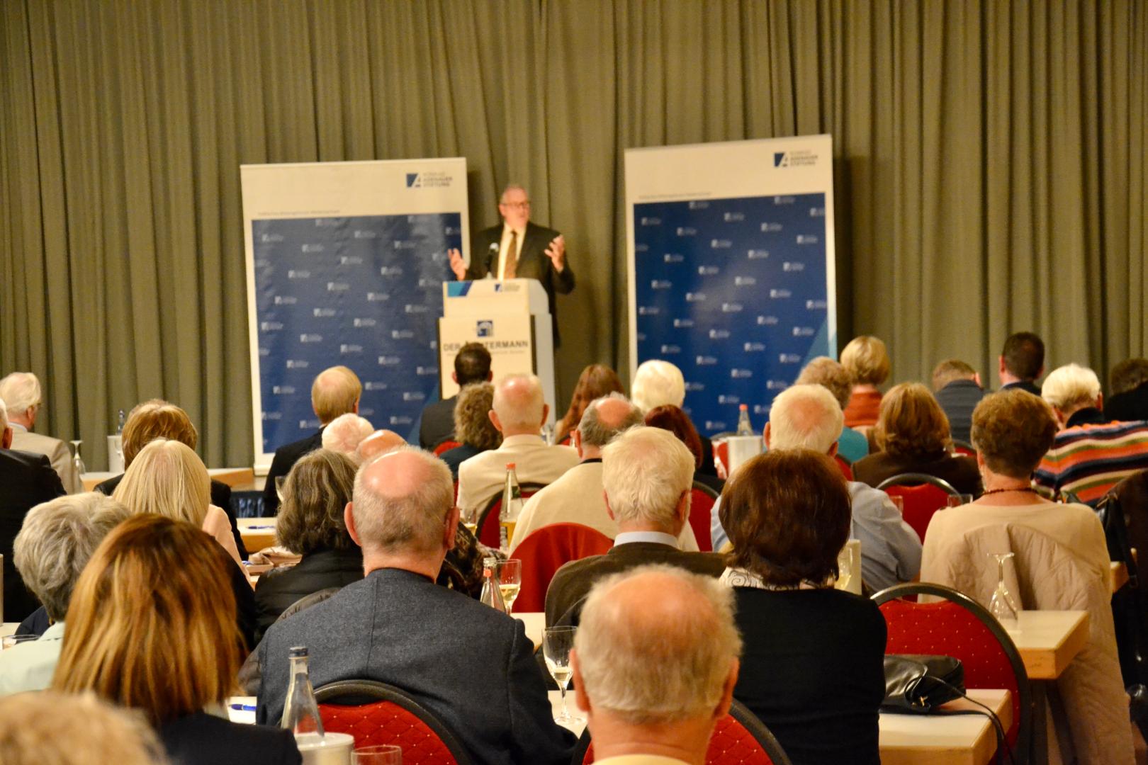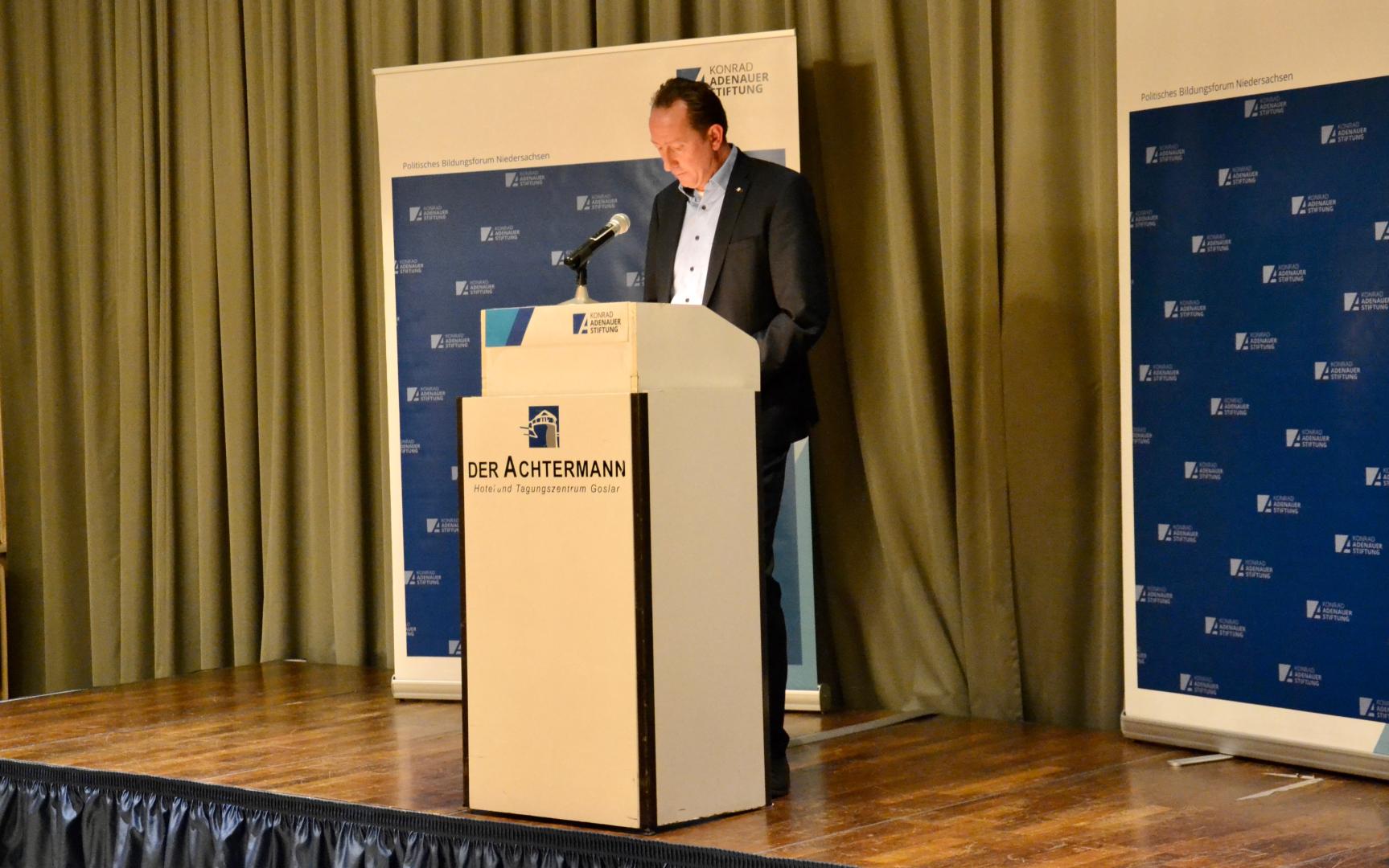 Christoph Bors, Leiter des Politischen Bildungsforums in Niedersachsen, eröffnete Veranstaltung. Nach einer kurzen historischen Einführung stellte er das Programm vor und übergab das Wort an Ralph Bogisch. In einem kurzen Grußwort dankte er unter anderem der Konrad-Adenauer-Stiftung für die Kontinuität und Regelmäßigkeit mit der die Veranstaltung jährlich stattfindet. Anschließend trat Frank Oesterhelweg an das Rednerpult und führte in den Themenbereich des Abends ein. Zur Ausrichtung der christlich demokratischen Politik sagte er, Bewährtes solle man erhalten und Neues gestalten. „Wir brauchen den Mut anzuecken, um etwas anzustoßen“, sagte Oesterhelweg.
