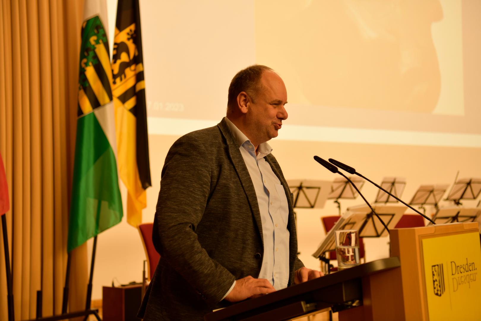 Oberbürgermeister Dirk Hilbert sprach danach und bedankte sich ebenfalls für die Arbeit von Dr. Joachim Klose. Seine Tätigkeit in der "Arbeitsgruppe 13. Februar“ wurde besonders herausgestellt und gelobt. „Gedenkkultur“, so Hilbert, „ist vor allem für Dresden unglaublich wichtig. Herr Dr. Klose hat durch seine Arbeit einen lokalen und nationalen Blick auf dieses Thema geschaffen.“