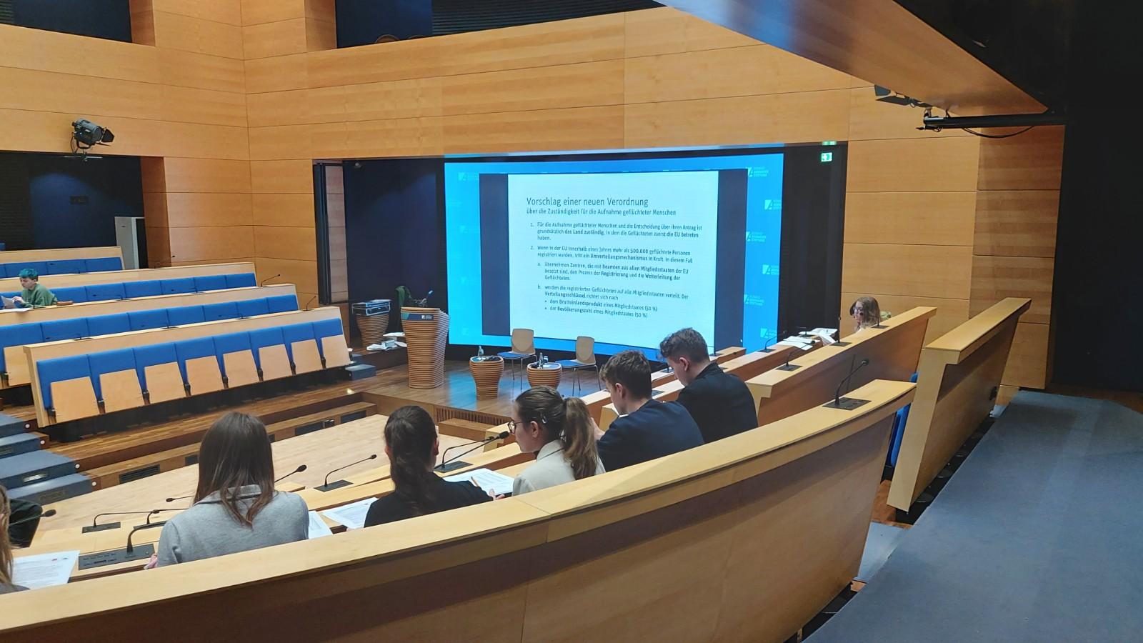 Dieses begann mit einer prägnanten inhaltlichen Einführung, bevor die Schülerinnen und Schüler ihre echten Namen ablegten und in die Rollen von EU-Politikern schlüpften. Während der nächsten fünf Stunden mussten sie für die ihnen zugewiesenen Rollen und politischen Ansichten einstehen. In Anlehnung an die realen Verhältnisse wurden sowohl der Europäische Ministerrat als auch das EU-Parlament nachgestellt. Zudem nahmen zwei Schüler die Rolle von EU-Kommissaren ein. Während das Parlament im großen Plenarsaal der Akademie hitzig debattierte, konnte der Ministerrat in anderen Räumlichkeiten tagen. Die Simulation von gleich drei Organen der EU fügte dem Planspiel Komplexität hinzu. Die ganze Zeit über galt es die Standpunkte der anderen Organe zu berücksichtigen und in informellen Gesprächen Gemeinsamkeiten und Differenzen zu sondieren. Innerhalb von zwei Lesungen in Parlament und Rat wurde der Entwurf umfangreich modifiziert, bevor es im Rat zur finalen Abstimmung kam. Obwohl der Abstimmung eine konstruktive Debatte vorangegangen war, erzielte der Entwurf im Ministerrat keine Mehrheit.