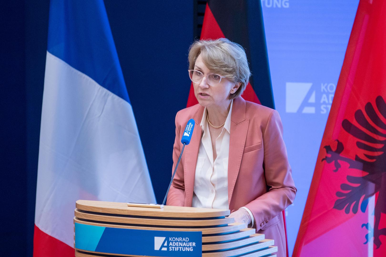 Im Fokus des ersten Veranstaltungsteils stand die Perspektive der deutschen Bundesregierung auf die Region, hochrangig vertreten durch den außen- und sicherheitspolitischen Berater von Kanzler Scholz, Jens Plötner. Bereichert wurde die Diskussion dabei um Kommentare von Jürgen Hardt MdB, außenpolitischer Sprecher der CDU/CSU-Bundestagsfraktion. Eigens für die Konferenz nach Berlin gereist war zudem Bénédicte Contamin, Sonderberaterin des Direktors für Kontinentaleuropa im Französischen Außenministerium. Sie erweiterte die Diskussion um den französischen Blick auf den Westbalkan und sprach auch aus der Perspektive der französischen EU-Ratspräsidentschaft. Im anschließenden zweiten Veranstaltungsteil diskutieren Manuel Sarrazin, neuer Sondergesandter der Bundesregierung für die Länder des westlichen Balkans, und Dr. Christoph Heusgen, Vorsitzender der Münchner Sicherheitskonferenz und KAS-Fellow, zu aktuellen Herausforderungen für die euro-atlantische Kooperation und Stabilität mit Blick auf den westlichen Balkan.