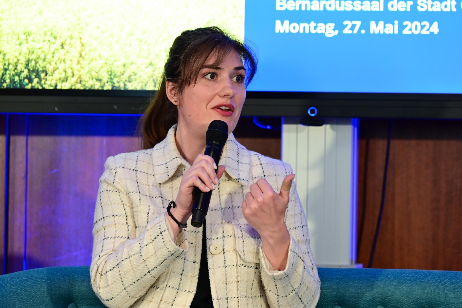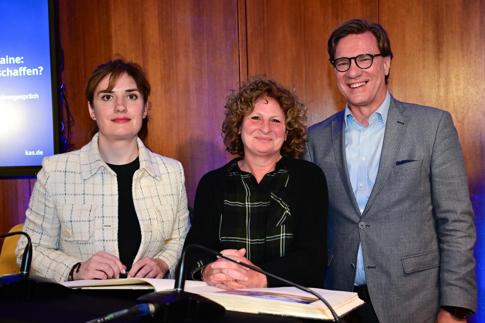 Das moderierte Gespräch begann mit einem Impuls von Generalkonsulin Iryna Shum. In ihrem Vortrag gab sie einen detaillierten Überblick über die aktuelle Situation und zeigte Selbstbewusstsein und Optimismus. Entgegen allen ursprünglichen Prognosen habe ihr Heimatland, die Ukraine, den russischen Streitkräften entschlossen Widerstand geleistet und den Angreifern große Verluste zugefügt. Anschließend erlebten die Zuhörenden eine äußerst informative Diskussion zwischen Moderatorin Cosima Gill, Iryna Shum und Nico Lange. Mit Tiefgründigkeit setzten sie sich unter anderem mit der anstehenden Ukraine-Friedenskonferenz im Juni in der Schweiz auseinander. Ein weiteres Diskussionsthema war die Frage, was Deutschland tun könne und müsse, um die Ukraine in ihrem Freiheitskampf gegen Russland zu unterstützen. Iryna Shum fand passende Worte, als sie betonte: „Was wir für die Befreiung anderer Städte brauchen, ist noch mehr militärische Unterstützung. Wenn wir keine weitere Munition, Kampfflugzeuge oder Waffen zur Flugabwehr bekommen, gerät die Armee weiter in die Defensive. Die Lufthoheit zu stärken ist daher sehr, sehr wichtig.“ Nico Lange ergänzte: „Wir müssen in Deutschland die Anreize so setzen, dass unsere Produktion von Waffen und Ausrüstung schneller steigt. Putin weiß, dass wir nicht schnell viel produzieren. Das muss sich ändern.“