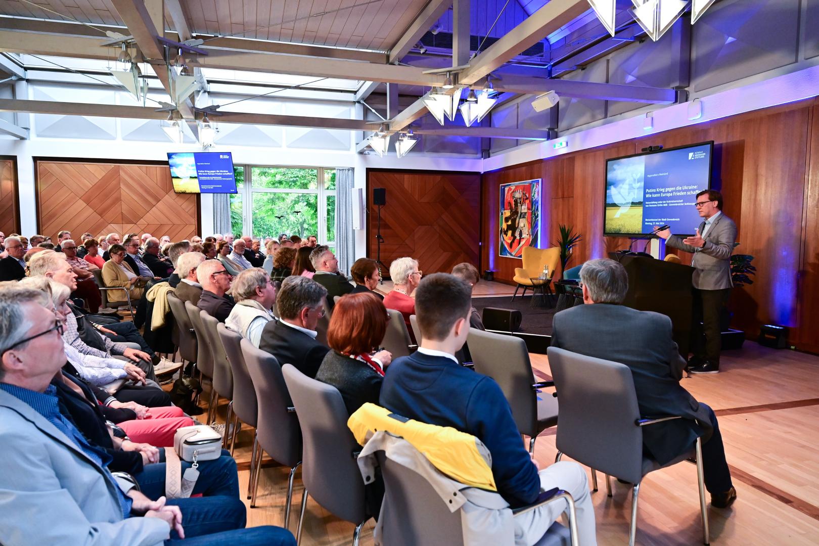 Nach der Begrüßung begann die Veranstaltung mit einer Einführung von Schirmherr Hermann Gröhe MdB. Der stellvertretende Vorsitzende der CDU/CSU-Fraktion bot einen fundierten Einblick in die aktuellen Entwicklungen in der Ukraine. Dabei bezog er eine klare Position und betonte die uneingeschränkte Solidarität und Unterstützung für die Ukraine: „Die Ukraine verteidigt in diesem Krieg auch Selbstbestimmung und Demokratie – und damit die Werte Europas.“ Gröhe hob die Notwendigkeit hervor, über die Verantwortung Deutschlands und Europas für die Sicherheit und die Unterstützung der Ukraine zu sprechen. Außerdem betonte er die Bedeutung des öffentlichen Dialogs: "Putin spielt mit der Angst der Deutschen, daher ist der öffentliche Austausch von entscheidender Bedeutung."
