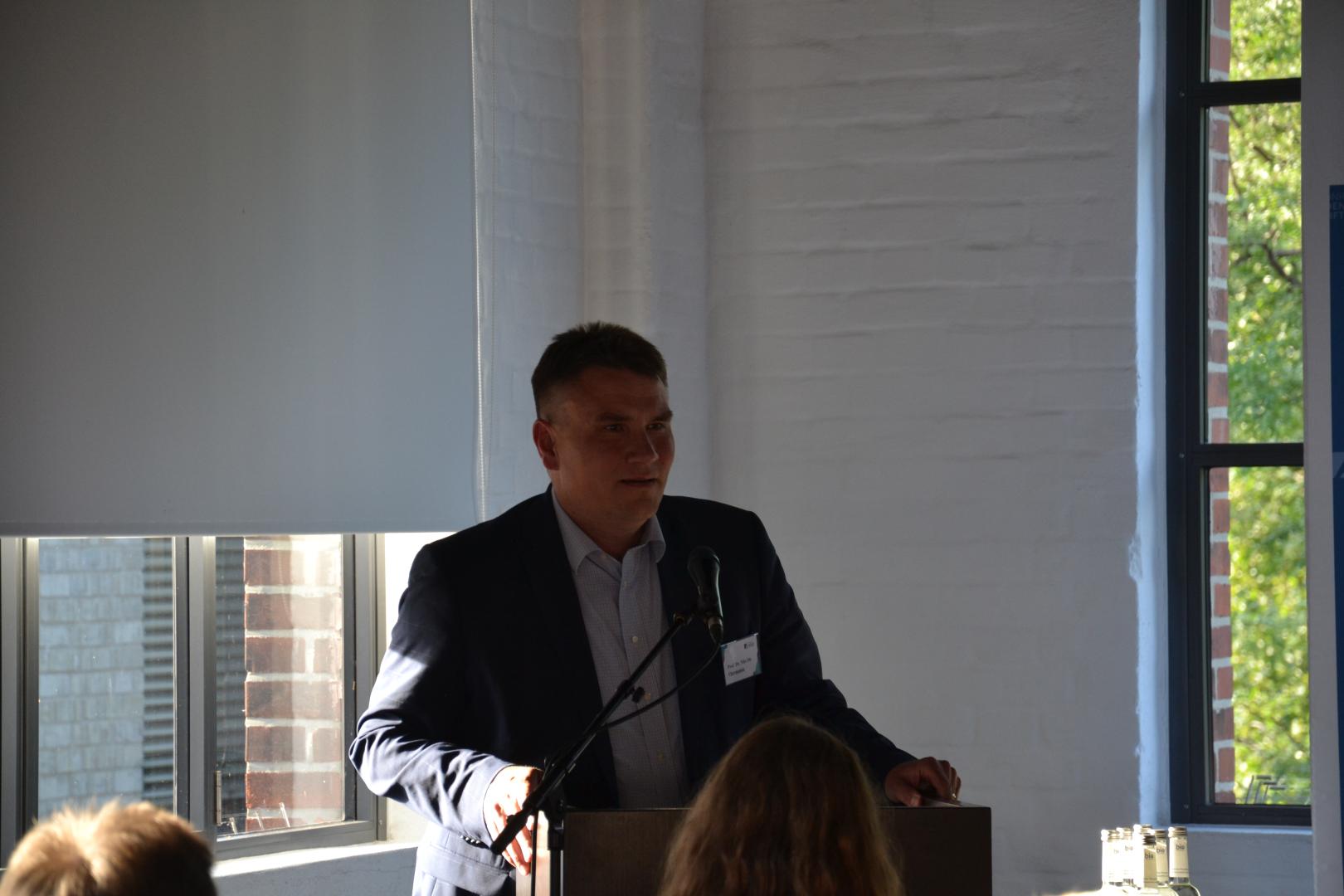 Prof. Dr. Nils Ole Oermann, Professor für Ethik an der Universität Lüneburg, stellte in seinem Impuls die Frage, wie in Deutschland Eliten ausgewählt würden. Dabei stellte er fest, dass der Begriff "Elite“ zumeist negativ konnotiert ist. Eliten seien jedoch wichtig, denn von ihrer Auswahl hänge das Schicksal einer jeden Gesellschaft ab. Oermann lobte das „Erhardmodell“, welches ein Wohlstandsversprechen nach Bildung und Anstrengung beinhaltet und Eliten hervorbringe, die nicht von sondern für die Politik leben. Nur mit solchen Politikern und Politikerinnen seien die Probleme von gestern, heute und morgen zu lösen.