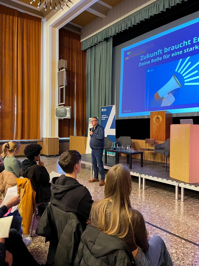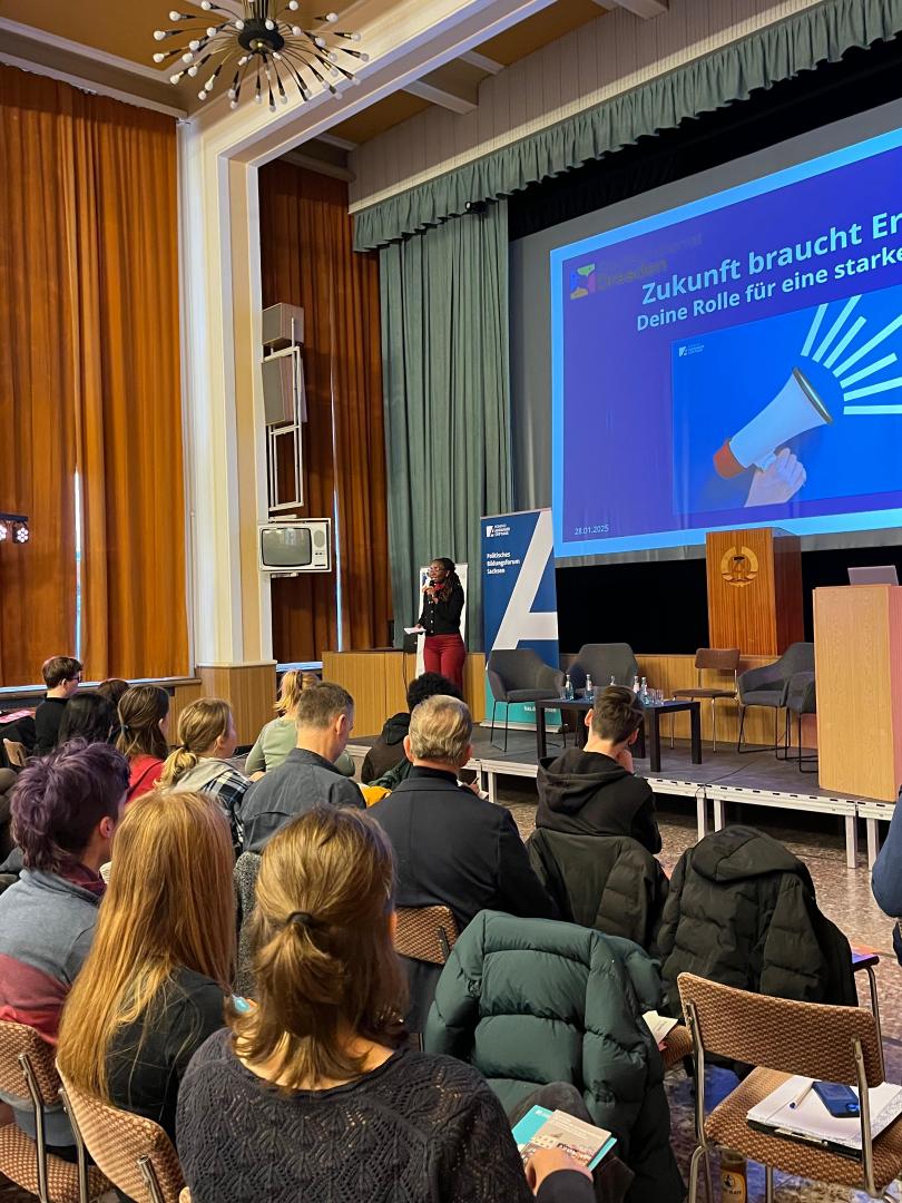 Der Tag startete für die mit einer Begrüßung von Irène Mahano, Referentin des Politischen Bildungsforum Sachsens, von Viktoria Torno und Yann Ywen Egon Lindemann, Vorstandsmitglieder des Stadtschülerrat Dresdens, und außerdem begrüßte Jan Donhauser, der Bildungsbürgermeister der Stadt Dresden, das Publikum.