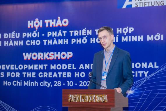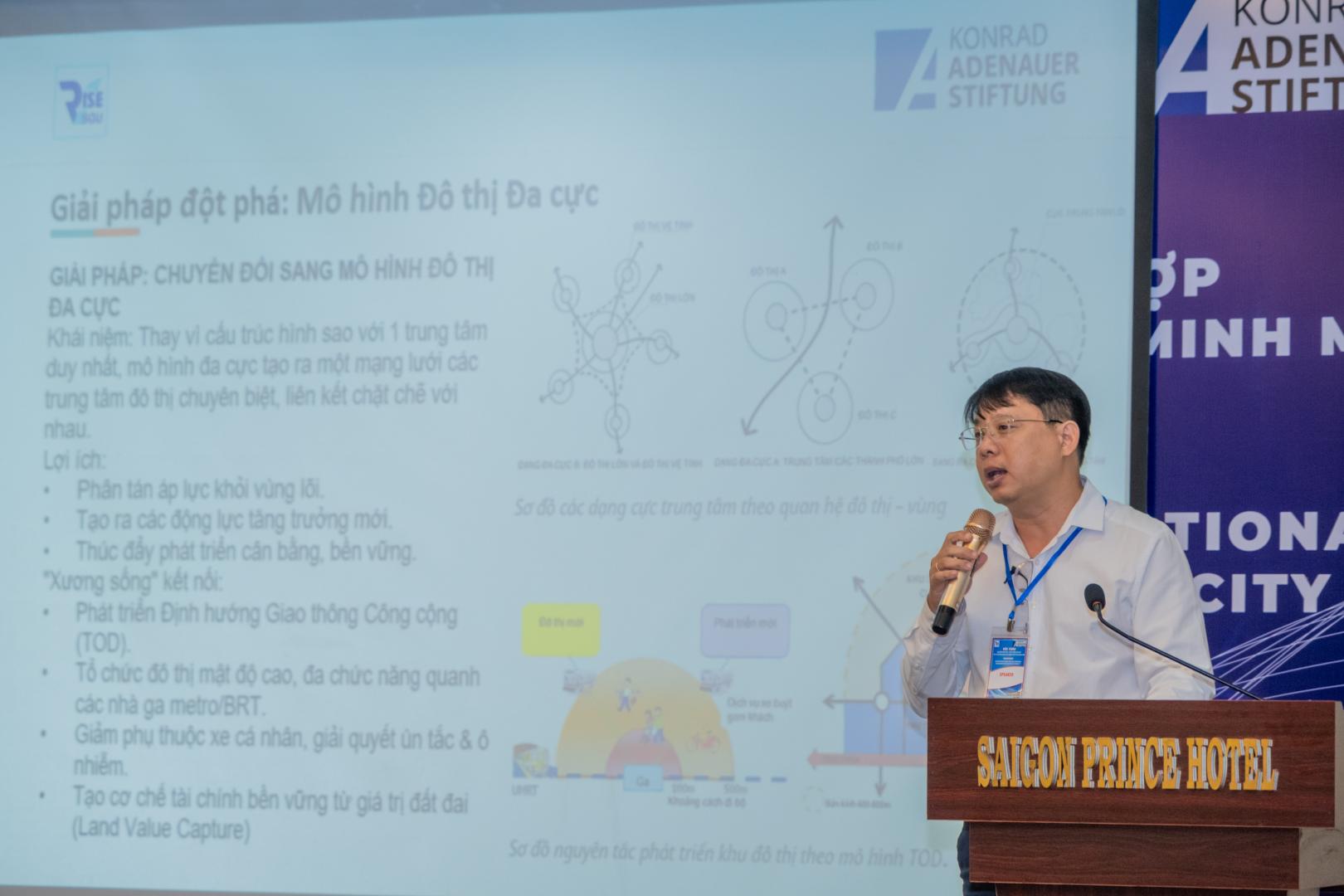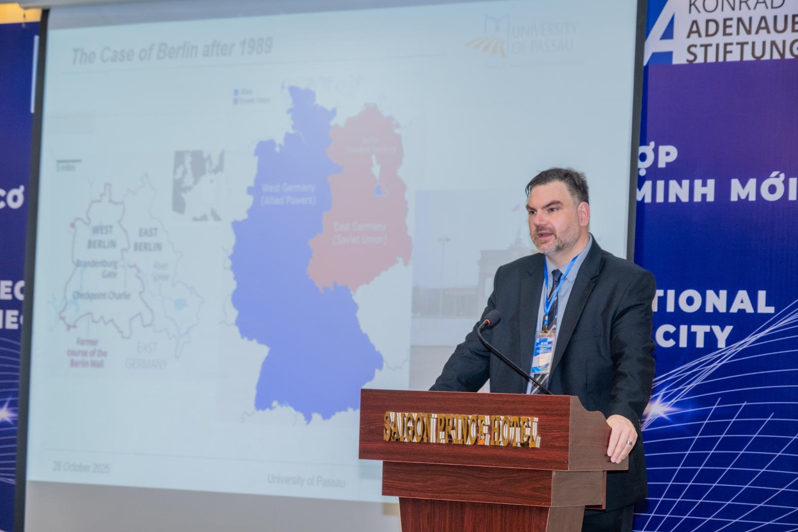 Một điểm nhấn đáng chú ý tại hội thảo là phần trình bày của Tiến sĩ Soeren Keil từ Đại học Passau (CHLB Đức). Bài trình bày của ông mang đến những góc nhìn sâu sắc từ các mô hình quản trị đô thị tại châu Âu. Tiến sĩ Keil đã phân tích hai trường hợp điển hình: mô hình quản trị của Berlin sau khi nước Đức thống nhất và các cải cách tại London sau năm 1997. Từ những bài học thực tiễn này, ông nhấn mạnh tầm quan trọng của quản trị tích hợp, sự linh hoạt trong hoạch định chính sách và nguyên tắc phân quyền trong quản lý đô thị.