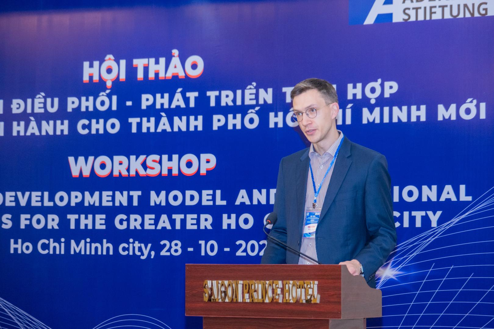 Bên cạnh đó, Tiến sĩ Keil cũng chỉ ra những thách thức phổ biến mà các vùng đô thị đang phải đối mặt, bao gồm: bất bình đẳng không gian, gia tăng dân số, thiếu hụt nhà ở, áp lực môi trường và nhu cầu ngày càng cao về hạ tầng. Đối với TP. Hồ Chí Minh, ông đề xuất một khung quản trị mang tính thích ứng và bao trùm, được hỗ trợ bởi các khoản đầu tư chiến lược vào hạ tầng kỹ thuật, hệ thống dữ liệu và phát triển nguồn nhân lực.