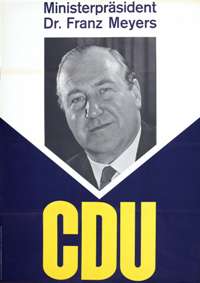 Im Sog der Bundestagswahl von 1957 erreicht die CDU bei der Landtagswahl am 6. Juli 1958 die absolute Mehrheit. Mit einem Stimmenanteil von 50,5 Prozent erzielt sie ihr bis heute bestes Ergebnis in der Geschichte nordrhein-westfälischer Landtagswahlen. In die Staatskanzlei kehrt allerdings nicht Karl Arnold zurück, der eine Woche vor der Wahlentscheidung verstorben ist. In der CDU-Landtagsfraktion setzt sich bei der Kür des Kandidaten für das Amt des Ministerpräsidenten der frühere Innenminister Franz Meyers, der 1957 Adenauers erfolgreichen Bundestagswahlkampf organisiert hat, deutlich gegen die beiden Landesparteivorsitzenden Wilhelm Johnen und Josef Hermann Dufhues sowie den Landtagspräsidenten Josef Gockeln durch. Die Wahl von Meyers zum neuen Ministerpräsidenten erfolgt am 21. Juli 1958. Zunächst steht er einer Alleinregierung der CDU vor. Nach der Landtagswahl von 1962, bei der die CDU ihre absolute Mehrheit verliert, aber die stärkste politische Kraft bleibt, führt er eine Regierungskoalition von CDU und FDP an.