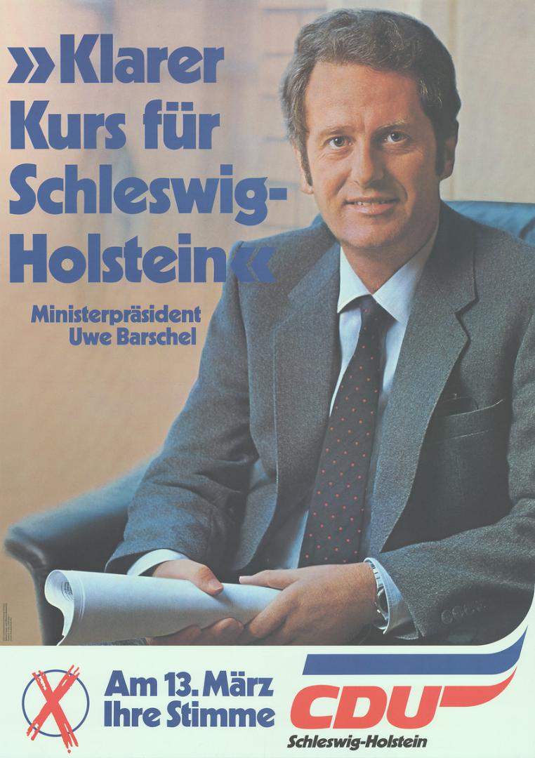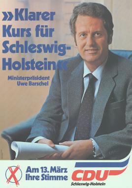 Mit der Wahl Helmut Kohls zum Bundeskanzler 1982 verließ Gerhard Stoltenberg Kiel, um in Bonn Bundesfinanzminister im Kabinett Kohl zu werden. Sein Weggang leitete in Schleswig-Holstein eine neue Ära ein. Erstmals seit 1951 lagen Landesvorsitz und das Amt des Ministerpräsidenten nicht mehr in einer Hand. Stoltenberg behielt das von ihm erfolgreich geführte Amt des CDU-Landesvorsitzenden, während der 38-jährige Uwe Barschel zum Ministerpräsidenten gewählt wurde. Barschel war, obwohl noch sehr jung, bereits seit 1960 in der JU aktiv und gehörte seit 1969 dem CDU-Landesvorstand an. Als Vorsitzender der CDU-Fraktion von 1973 bis 1979 und als Innenminister von 1979 bis 1982 hatte er schon reichlich politische Erfahrung gesammelt. Er stand zunächst vor der Herausforderung, das Erbe des beliebten Ministerpräsidenten Stoltenberg anzutreten. Mit der Erhöhung der Förderung dänischer Schulen in Schleswig-Holstein konnte er schon bald einen politischen Erfolg verbuchen. Bei der Landtagswahl im März 1983 verteidigte die CDU ihre absolute Mehrheit im Landtag und Ministerpräsident Barschel wurde im Amt bestätigt. In der folgenden Legislaturperiode verschlechterten sich jedoch die Beziehungen zwischen der CDU und der SPD-Opposition im Landtag. Am Vorabend der Landtagswahl am 13. September 1987 berichtete der „Spiegel“, Barschel habe veranlasst, den SPD-Spitzenkandidaten, Björn Engholm im Wahlkampf gezielt zu verleumden und beschatten zu lassen. Durch die „Barschel- oder Waterkant-Affäre“ fiel die CDU auf 42,6% zurück. Die SPD wurde mit 45,2% der Stimmen stärkste Partei. Im Landtag entstand zwischen CDU und FDP auf der einen und SPD und SSW auf der anderen Seite eine Pattsituation. Obwohl Barschel auf der berühmten „Ehrenwort-Pressekonferenz“ am 18. September 1987 alle Vorwürfe abstritt, weigerte sich die FDP, Koalitionsverhandlungen mit ihm zu führen. Daraufhin trat Ministerpräsident Barschel am 2. Oktober 1987 von seinem Amt zurück. Er verließ direkt danach Schleswig-Holstein, um in Urlaub zu fliegen. Am 11. Oktober 1987 wurde er jedoch tot in einem Hotel in Genf aufgefunden.