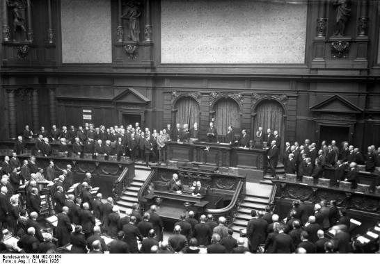 Nach dem Ende des Ersten Weltkriegs wurde im Zuge der Novemberrevolution 1918 die parlamentarische Demokratie in Deutschland eingeführt. Nach der Weimarer Reichsverfassung wurde der Reichstag auf vier Jahre gewählt. Wahlberechtigt waren alle Deutschen (erstmals auch Frauen) ab 20 Jahren. Zu den parlamentarischen Kompetenzen gehörten die Gesetzgebung, die Haushaltsbewilligung und die Kontrolle der Reichsregierung. Den Reichskanzler wählte das Parlament nicht; er wurde vom Reichspräsidenten ernannt, war jedoch in seiner Amtsführung vom Vertrauen des Parlaments abhängig. Eine verfassungsrechtlich herausragende Position nahm der Reichspräsident ein, da er direkt vom Volk gewählt wurde und die Befugnisse hatte den Reichstag aufzulösen sowie Notverordnungen mit Gesetzescharakter zu erlassen.