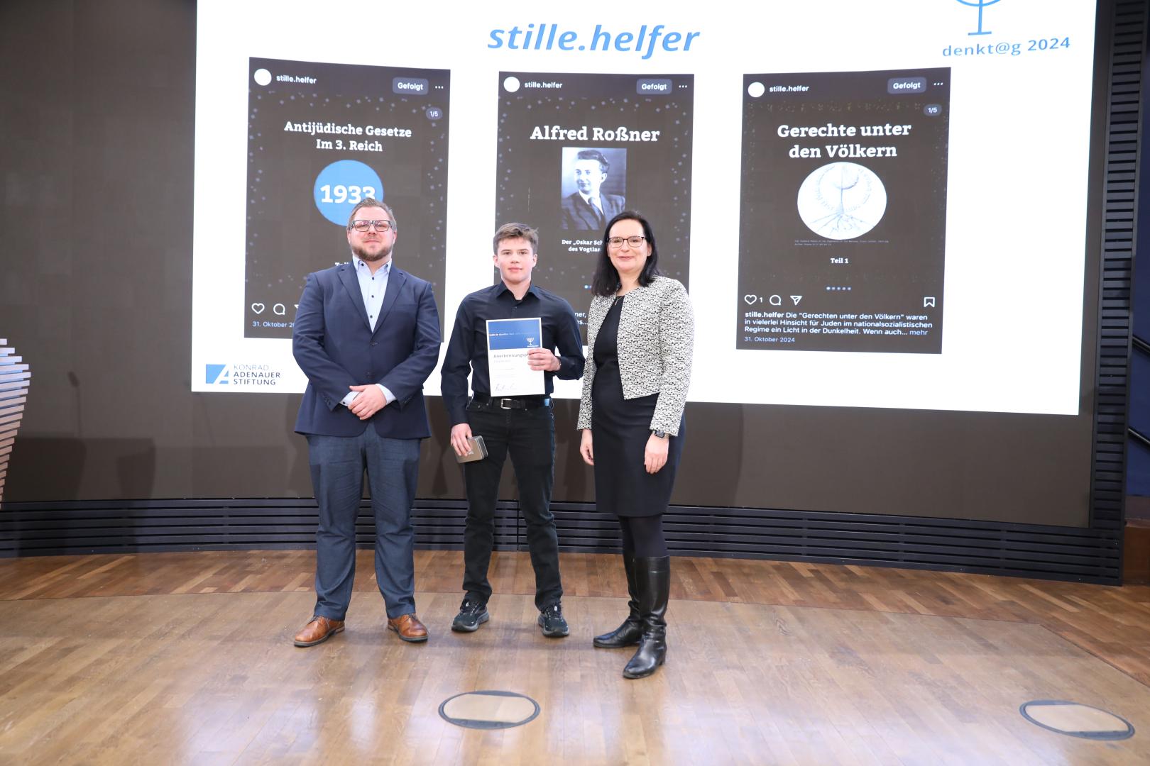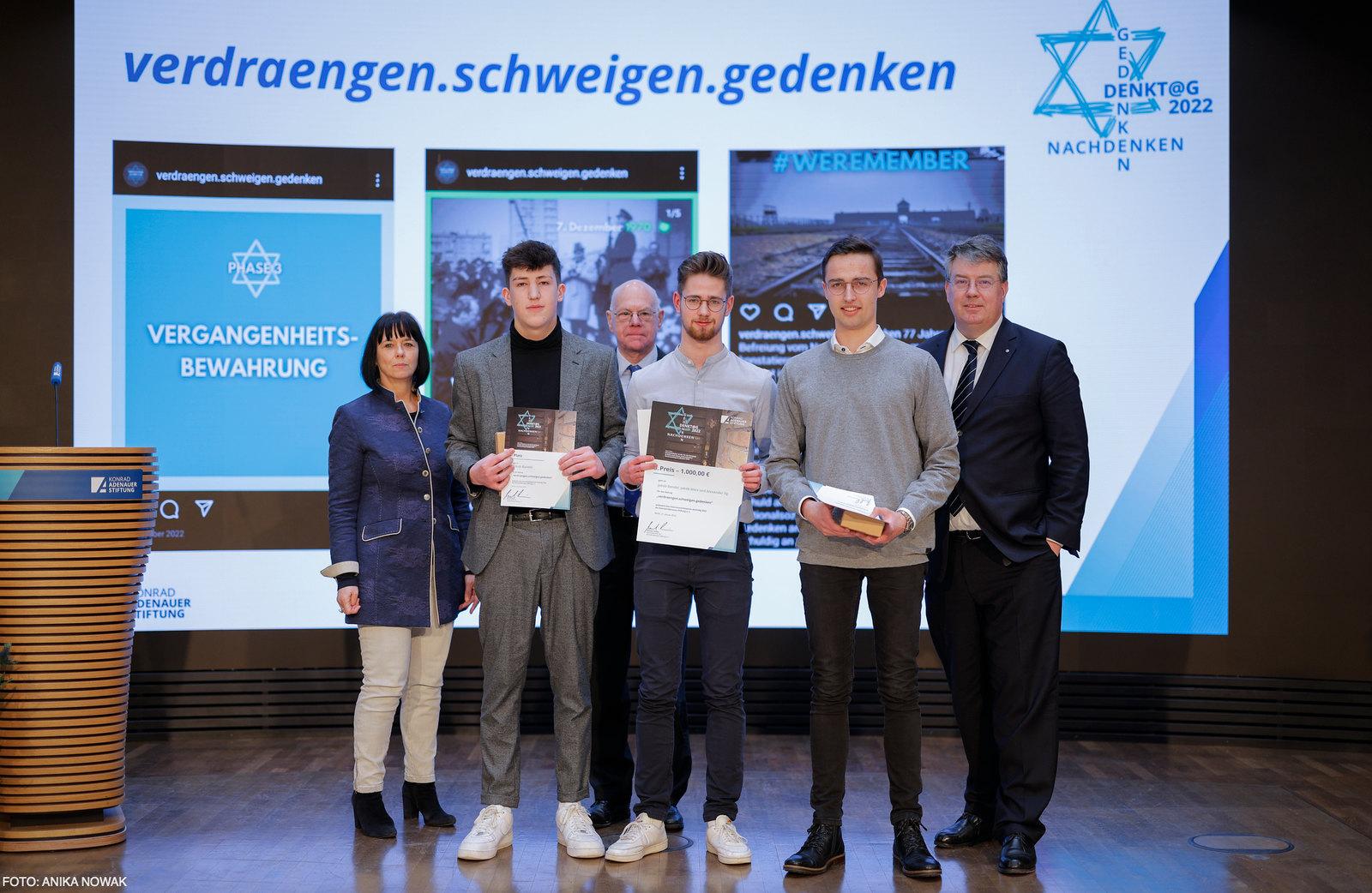 Den dritten Platz, prämiert mit 1.000 Euro, erreichten die Einzelteilnehmer Jakob März, Alexander Ilg und Jakob Bandel mit ihrem Projekt „Verdraengen.Schweigen.Gedenken“.