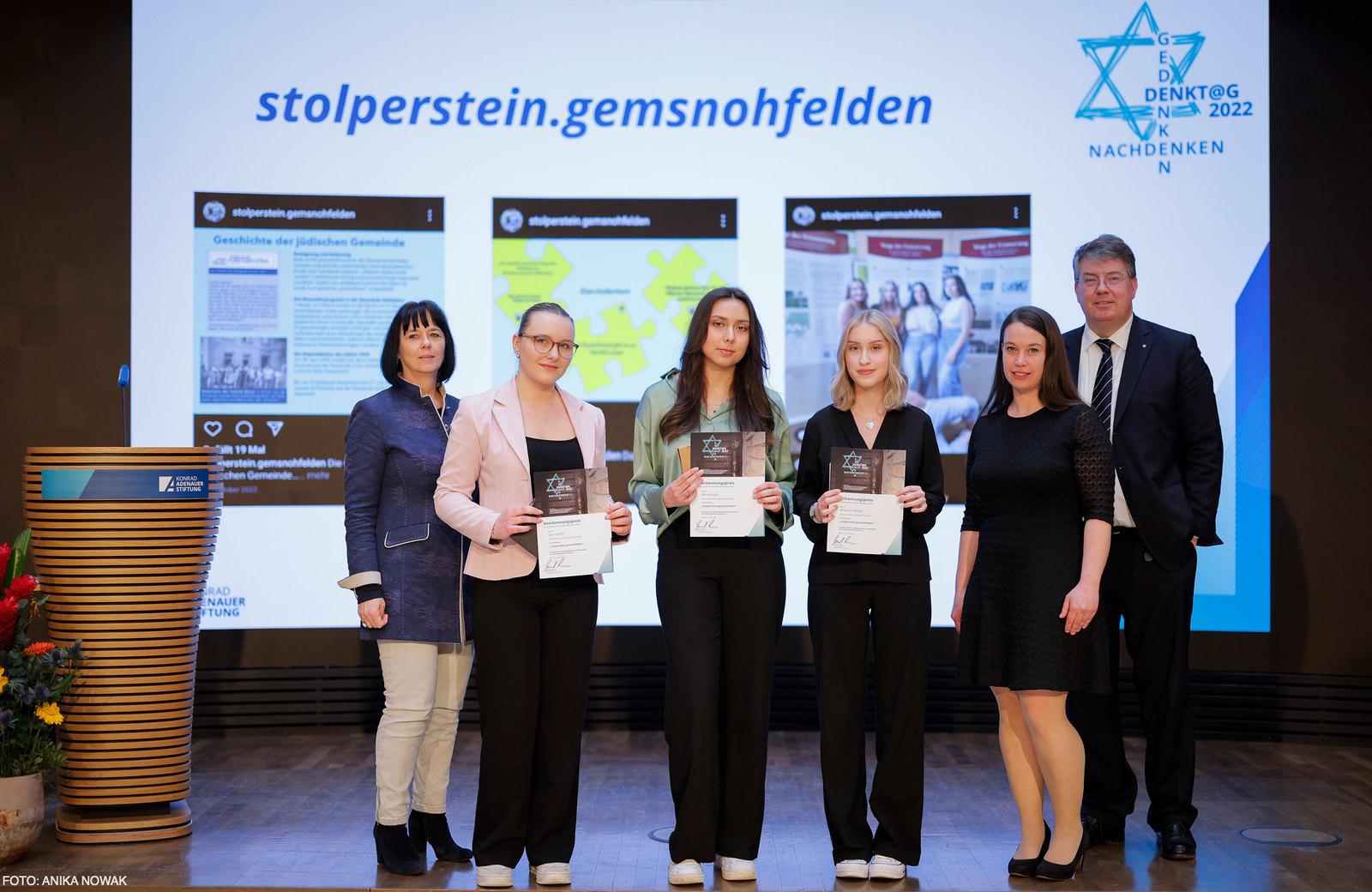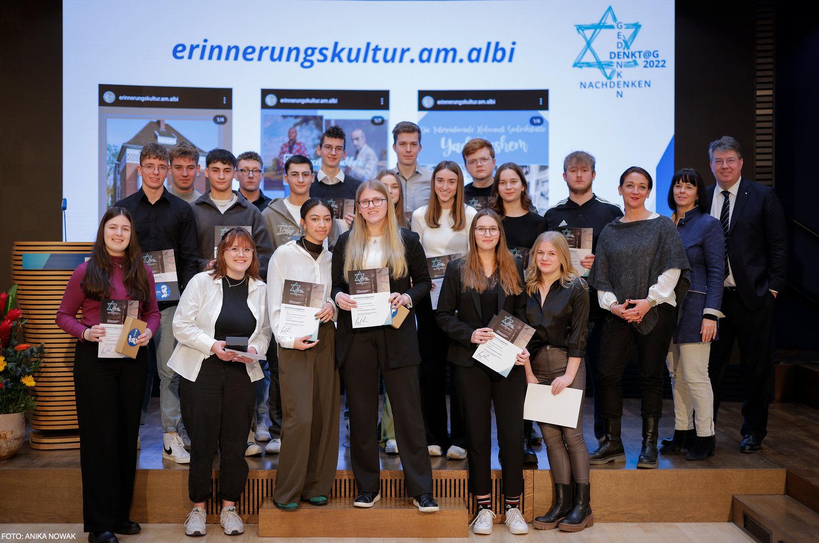 Anerkennungspreise erhielten Schülerinnen und Schüler der Maria Montessori Gesamtschule Aachen und des Pirckheimer-Gymnasiums Nürnberg, zwei Schüler des Hochwald-Gymnasiums Wadern, die Stolperstein-AGs der Gemeinschaftsschule Nohfelden-Türkismühle sowie des Arndt-Gymnasiums Berlin-Dahlem, Schülerinnen und Schüler der Goetheschule Wetzlar, Schülergruppen des Marie-Curie-Gymnasiums Hohen Neuendorf und des Adolf-Reichwein-Gymnasiums Heusenstamm, die Jugendguides der KZ-Gedenkstätte Hailfingen-Tailfingen Anna Pajdakovic und Benjamin Merkt sowie der Einzelteilnehmer Charlie Kilz aus Paderborn.