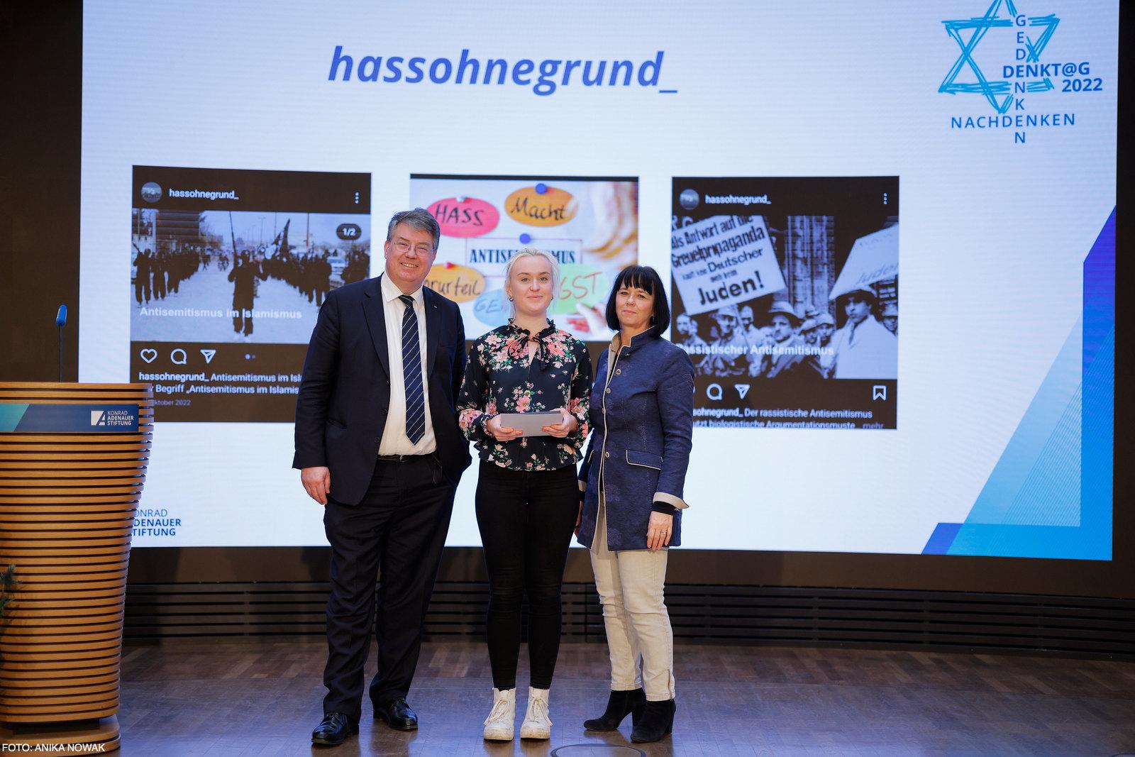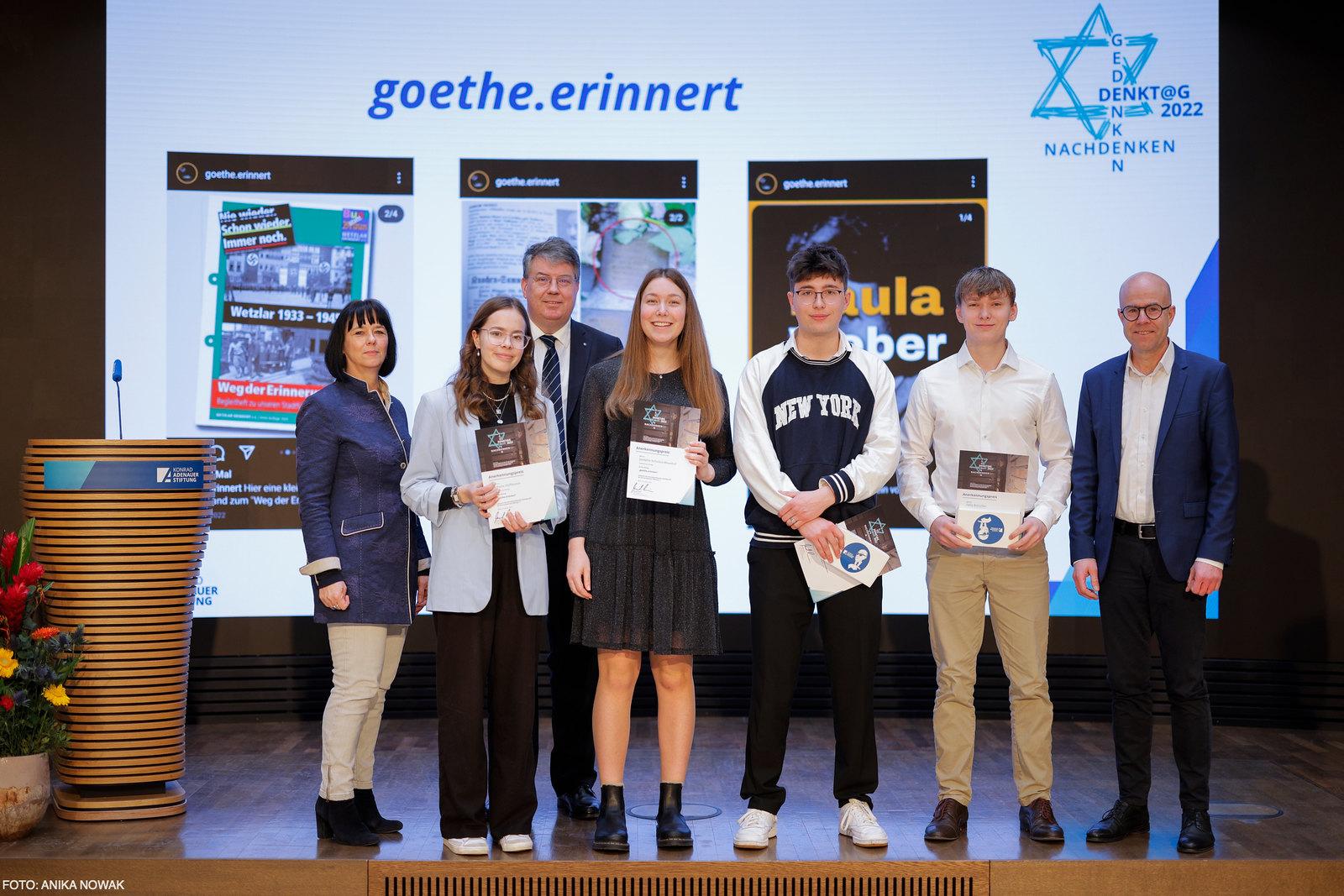 Anerkennungspreise erhielten Schüler des Gymnasiums Corvinianum in Northeim, des Georg-Büchner-Gymnasiums in Köln, des Jüdischen Gymnasiums Moses Mendelssohn in Berlin, der Christian Hülsmeyer Schule in Eydelstedt sowie die Einzelteilnehmer Dmitry Erokhin aus Bonn und Jana Glose aus Bersenbrück.