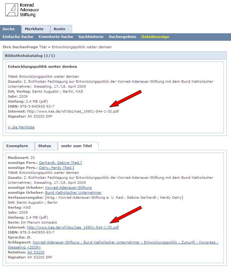 In der Vollanzeige eines Mediums wird im oberen Kasten der Link auf die Online-Publikation nur zum Kopieren angeboten. In der erweiterten Anzeige unter mehr zum Titel ist der Link in der Kategorie Internet anklickbar: