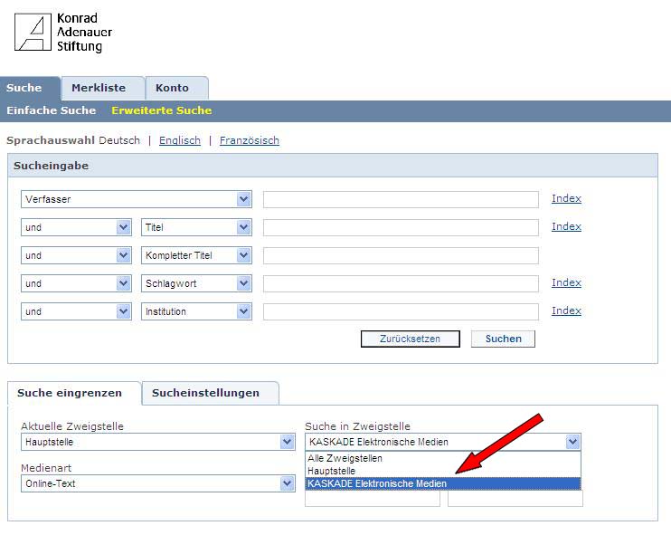 Oder die Suche in Zweigstelle wird im Gesamtkatalog auf KASKADE Elektronische Medien umgestellt: