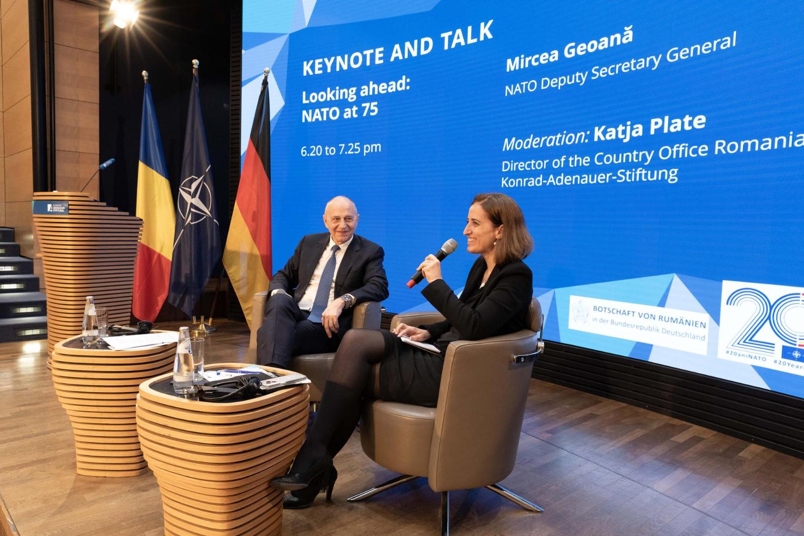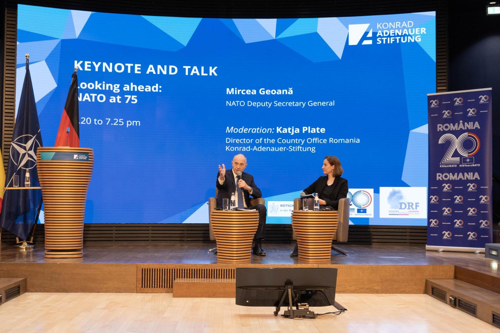 In der Diskussion, die von Katja Plate, Leiterin des KAS Auslandsbüros Rumänien, moderiert wurde, erläutert Geoană die Wichtigkeit die EU-Beitrittsprozesse der Westbalkanstaaten voranzutreiben und die EU-Annäherungen der Ukraine, Georgiens und der Republik Moldau weiterhin zu unterstützen. Das Schicksal der Ukraine beeinflusse auch die europäische Sicherheitsstruktur. Die Republik Moldau stehe vor ähnlichen Herausforderungen. Diskutiert wurde auch die Notwendigkeit, die Verteidigungsausgaben der EU-Länder aufzustocken. Die geografische Nähe zu den Kriegshandlungen in der Ukraine habe für Länder wie Rumänien deutlich gemacht, dass Investitionen in Luft- und Drohnenabwehr sowie Raketenabwehr unerlässlich sind.