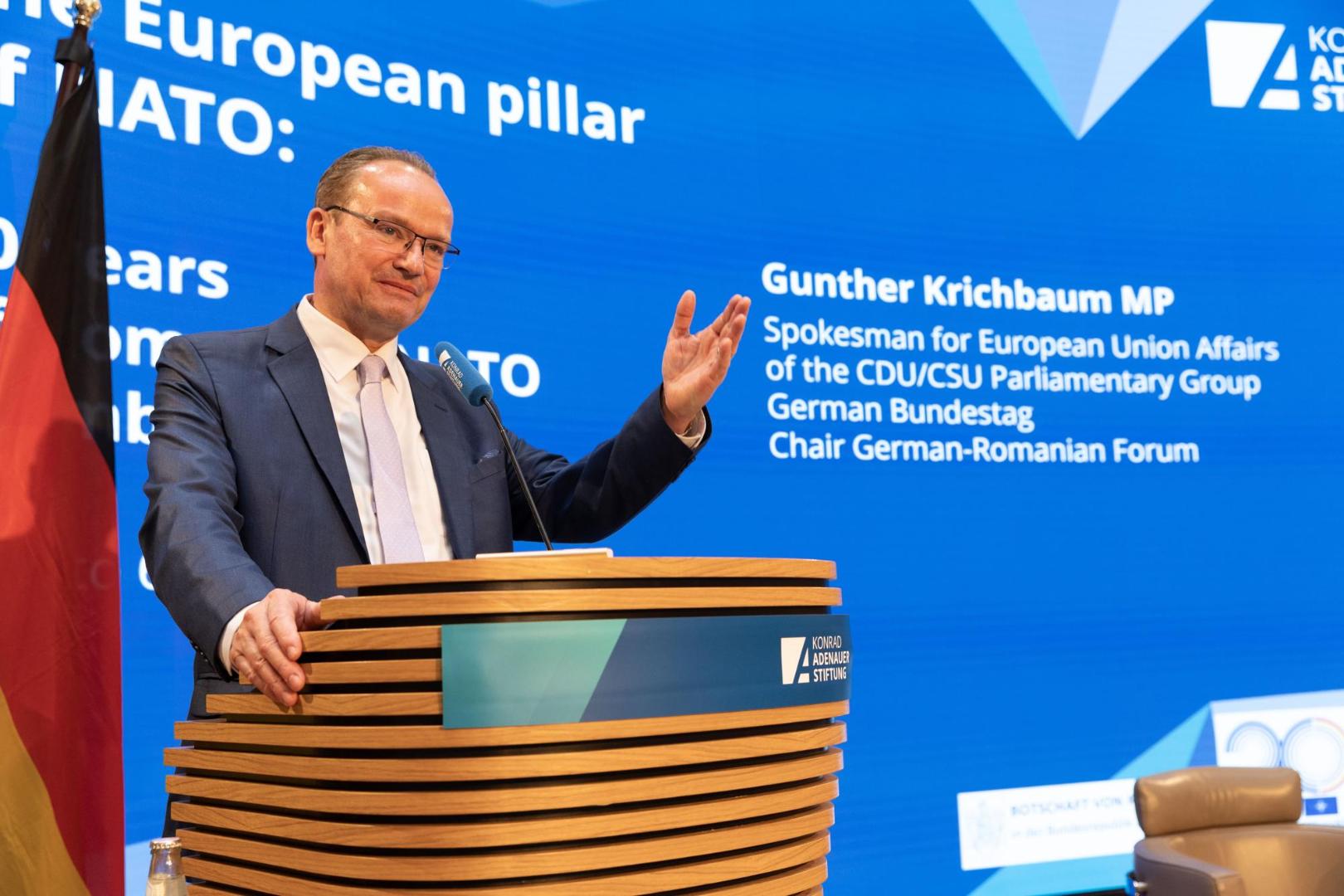 Der europapolitische Sprecher der CDU/CSU-Bundestagsfraktion und Vorsitzende des Deutsch-Rumänischen Forums, Gunther Krichbaum MdB, betonte die unterschiedliche Wahrnehmung und Wertschätzung der NATO in Westeuropa im Vergleich zu Ost- und Südosteuropa. “In diesen Regionen ist das Bewusstsein über die NATO als Garant für Sicherheit, Frieden und sozialen Wohlstand präsent”. Daran anknüpfend hob Krichbaum hervor, dass die drängenden Themen, mit denen sich das am 9. Juni neu gewählte EU-Parlament auseinandersetzen muss, Sicherheit, Verteidigung, Technologie und Innovation seien. Krichbaum stellte aber auch klar, dass die Herausforderungen für die NATO, insbesondere auch für Rumänien bestehen blieben.
